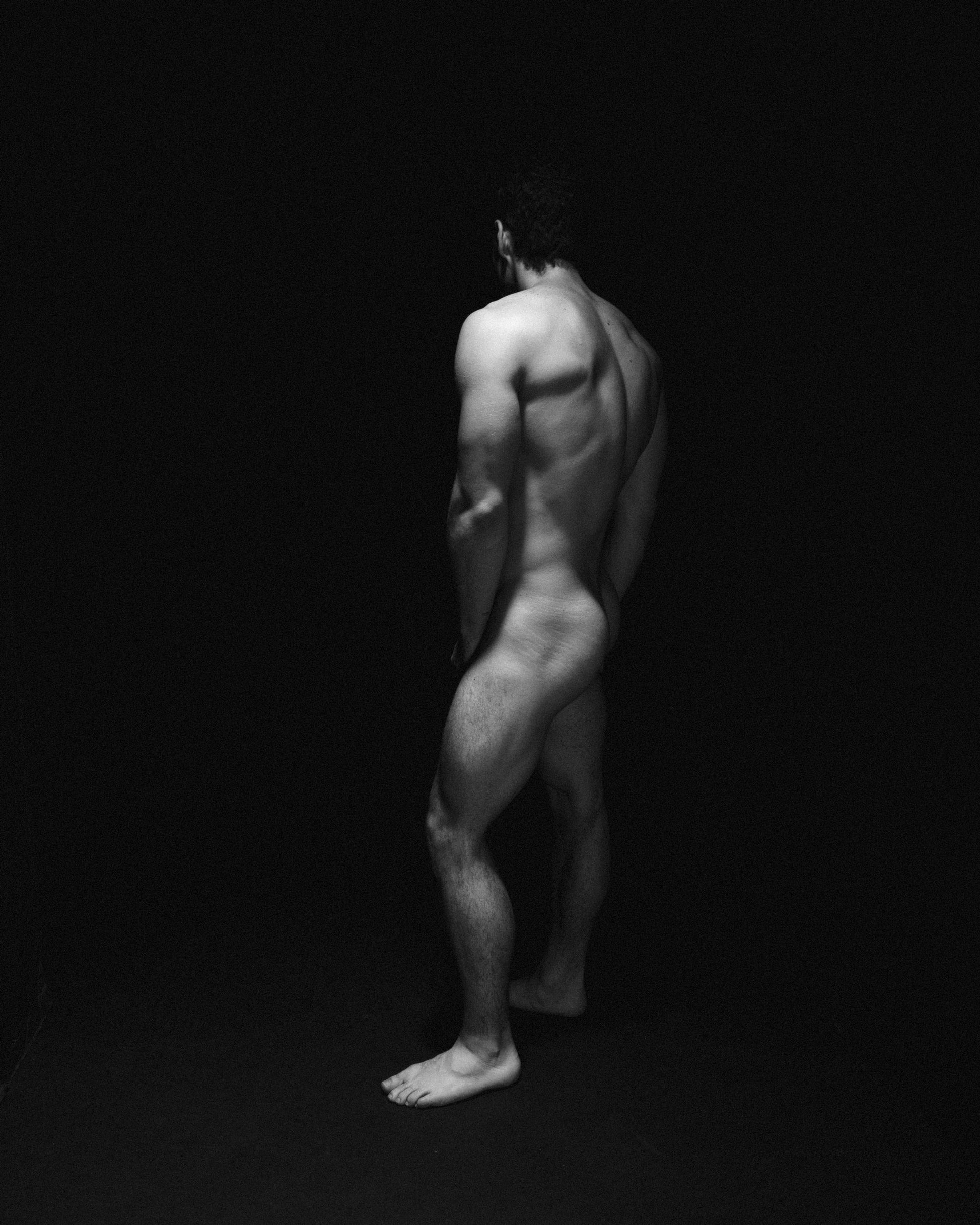 Here, the classic male nude is reimagined not as an invitation to desire but as an inquiry into the conditions of being desired — and what one sacrifices to meet that standard. The darkness surrounding him presses inward, perhaps symbolic of the internalized constraints of virile idealism. What we do not see becomes as important as what we do.