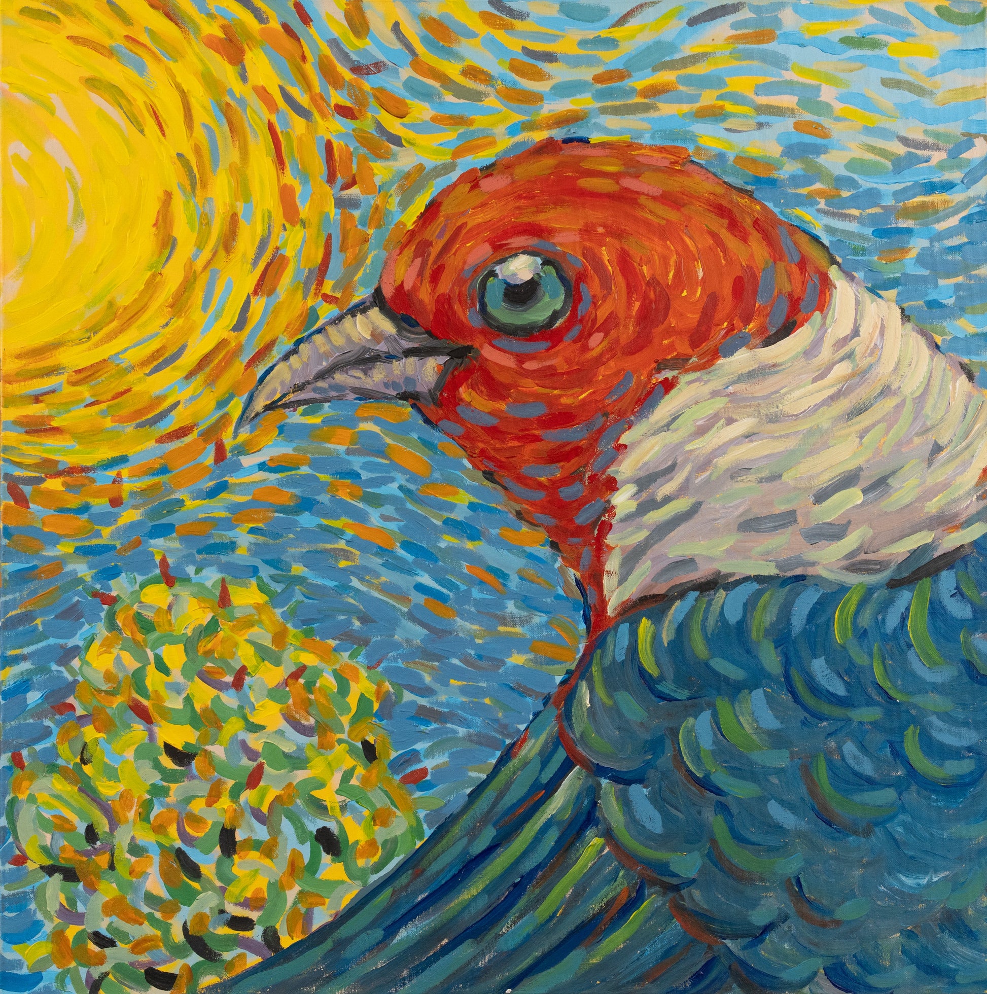 This painting captures a bird in a moment of serene observation, set against a swirling backdrop reminiscent of Van Gogh's vibrant sky. The bold red and white plumage contrasts beautifully with the blue and yellow strokes that compose the lively environment. This piece utilizes a thick, impasto technique, where the paint is applied in heavy, tactile layers that give the artwork a dynamic, almost three-dimensional effect. The eye of the bird, clear and reflective, serves as a focal point, inviting the viewer into a moment of shared connection with nature.