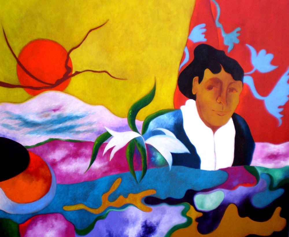 This painting showcases a style that is vibrant and rich in color, with abstract elements and expressive use of shapes. The blend of bold colors, the somewhat surreal composition, and the abstract depiction of the subject and background suggest influences from both Fauvism and Surrealism.