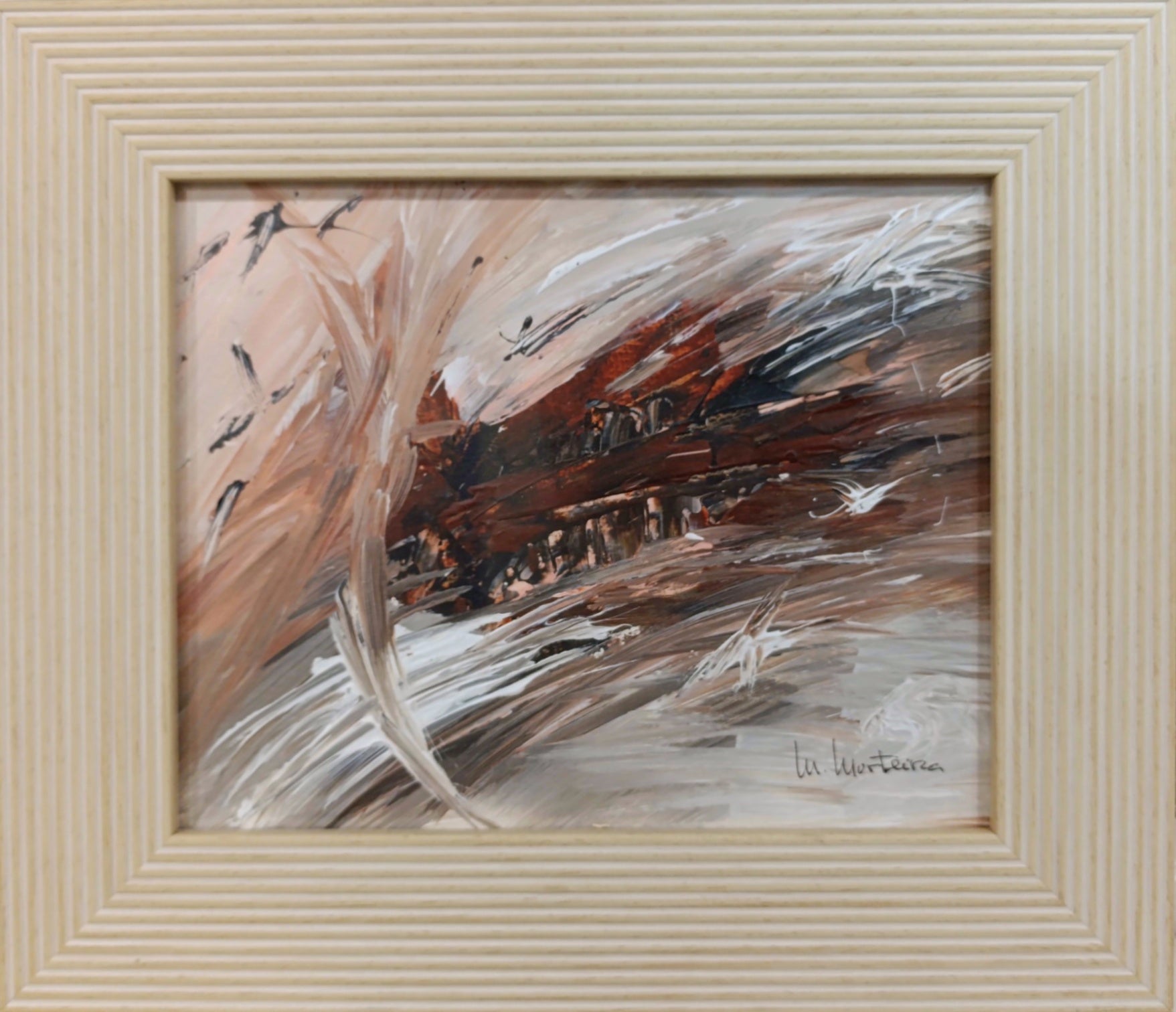 This dynamic abstract painting, titled "Abstract Momentum," showcases an energetic blend of earthy tones and fluid brushstrokes. Mariana Murteira has crafted a scene that captures the essence of movement and chaos. Swirling strokes of brown, black, and white race across the canvas, hinting at natural forces in motion—perhaps wind, storm, or waves. The composition evokes a sense of depth, with the bold layering of colors and textures pulling the viewer's eye through the painting, suggesting both action and tension. The warm palette of browns, contrasted with streaks of lighter whites, gives the piece a grounded yet turbulent atmosphere, inviting the viewer to interpret its rhythm and flow in personal ways.