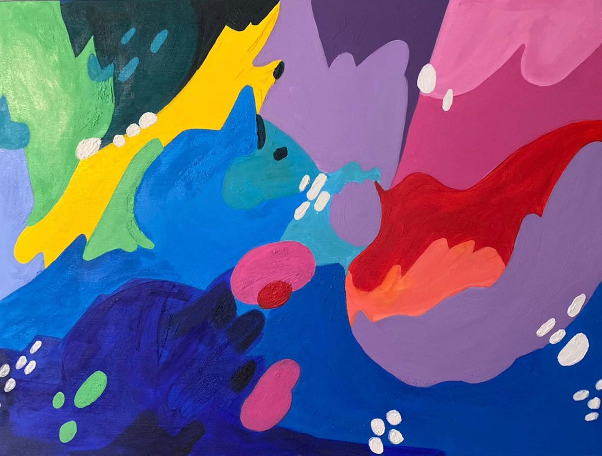 This abstract painting offers a dynamic interplay of bold shapes and fluid forms, evoking a sense of movement and energy. Vivid patches of green, yellow, blue, and purple harmonize with softer pinks and reds, while white accents provide contrast and balance. The organic shapes and flowing lines give the impression of a journey through an otherworldly landscape, where forms dissolve into one another, inviting viewers to interpret the meaning. This painting allows for personal reflection and emotional connection, making it a compelling centerpiece for any space.