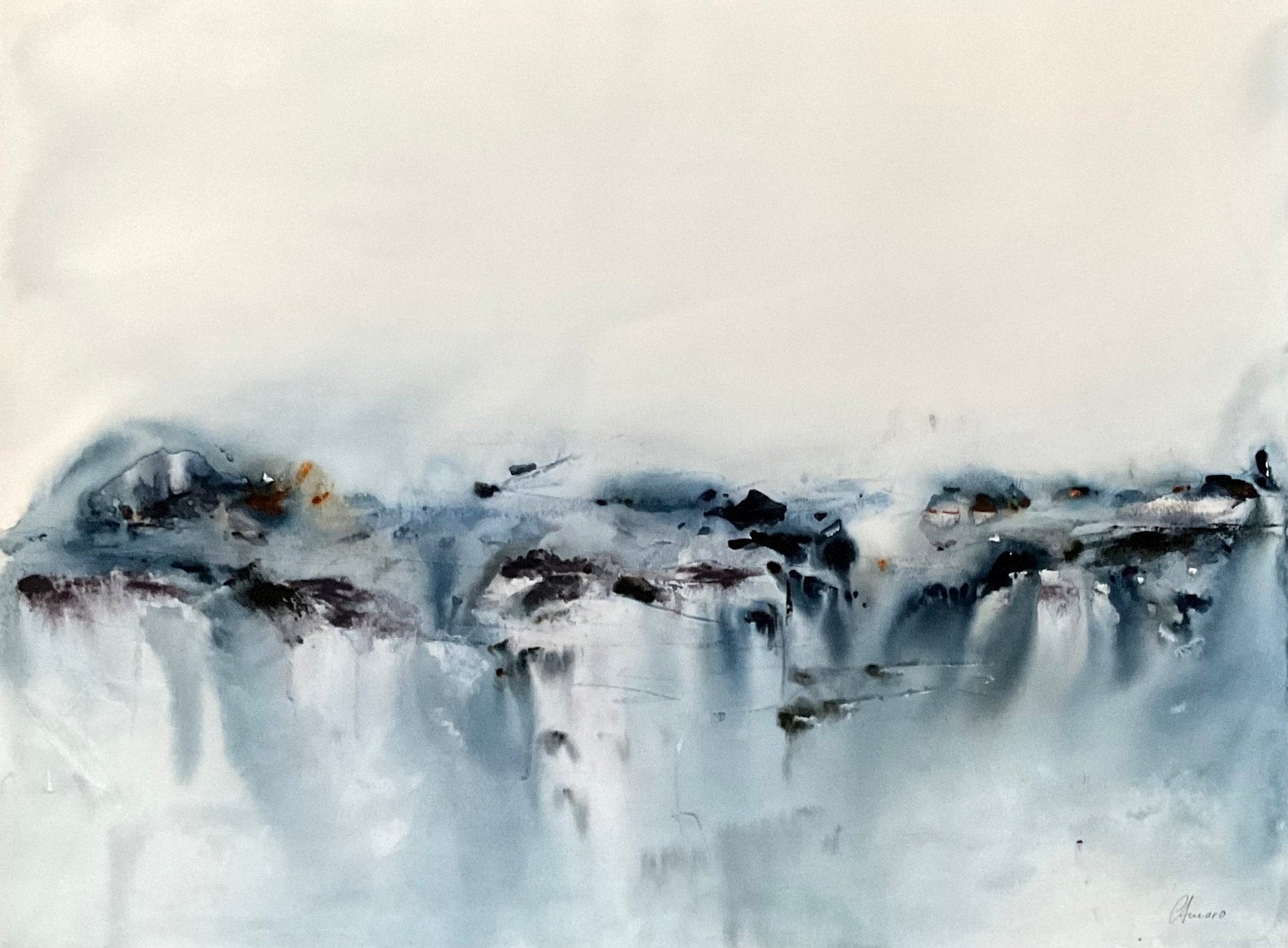 An evocative watercolor on 300 gsm paper that captures the essence of nature in transition. With soft gradients and diffused tones, the painting conjures the imagery of ice or snow slowly dissolving, a delicate balance between presence and absence. The minimalist landscape is open to interpretation, inviting viewers to immerse themselves in its tranquil yet melancholic atmosphere.
