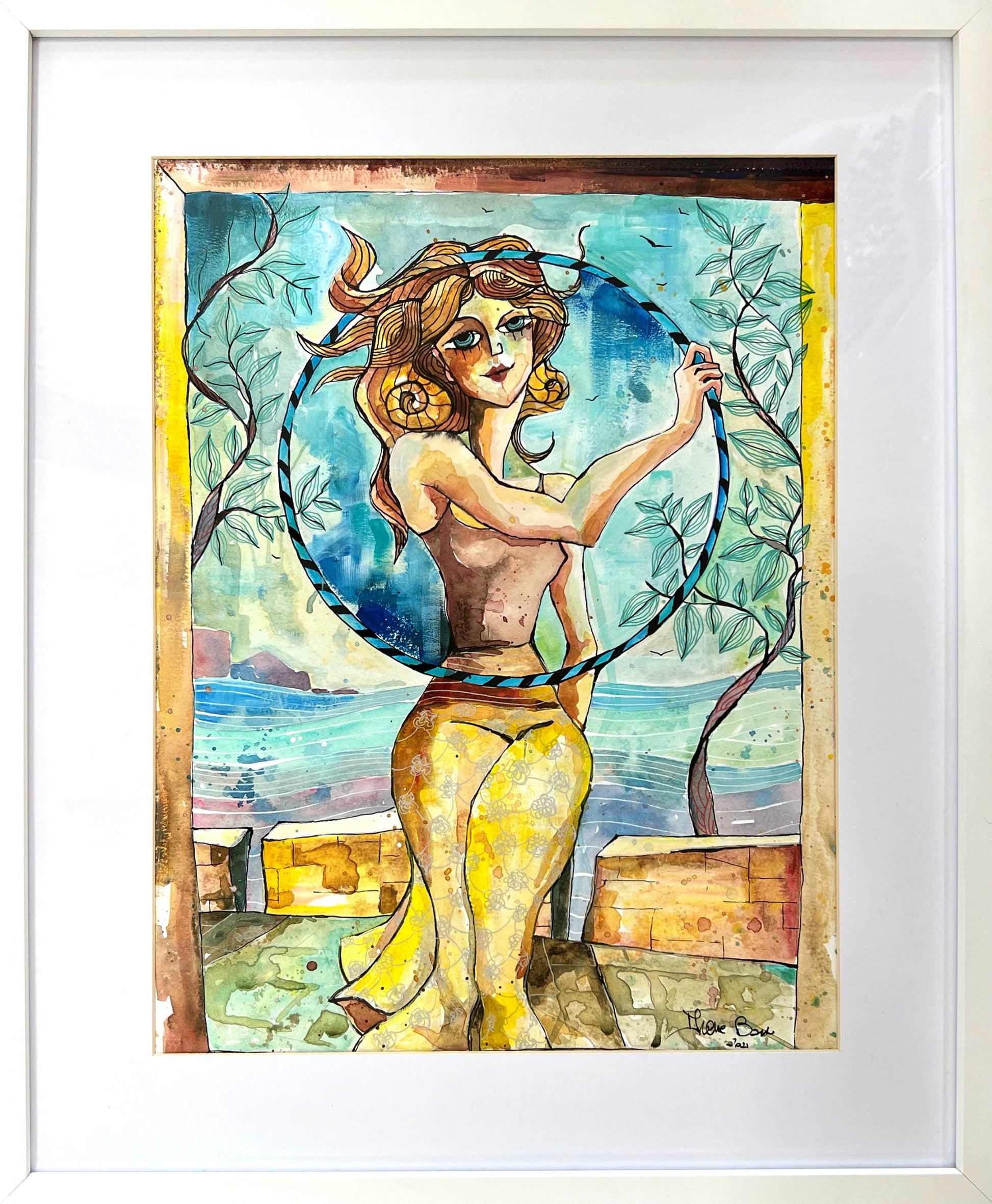 The backdrop of her portrait was a mesmerizing scene where the serene sea kissed the horizon, painted with strokes that mimicked the gentle caress of waves on sandy shores. The land, dotted with ancient stones, bore the marks of time, telling tales of old, while the vibrant flora whispered secrets of the earth's deep mysteries.
