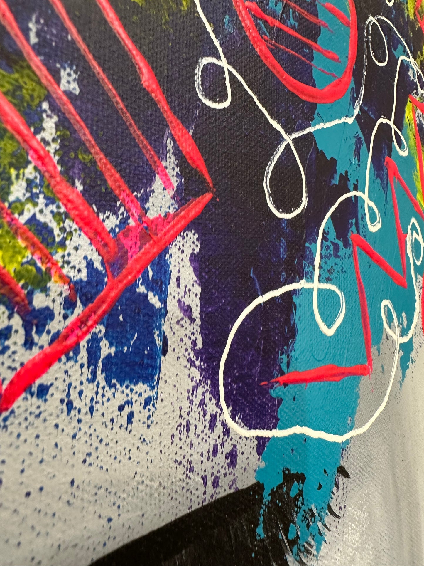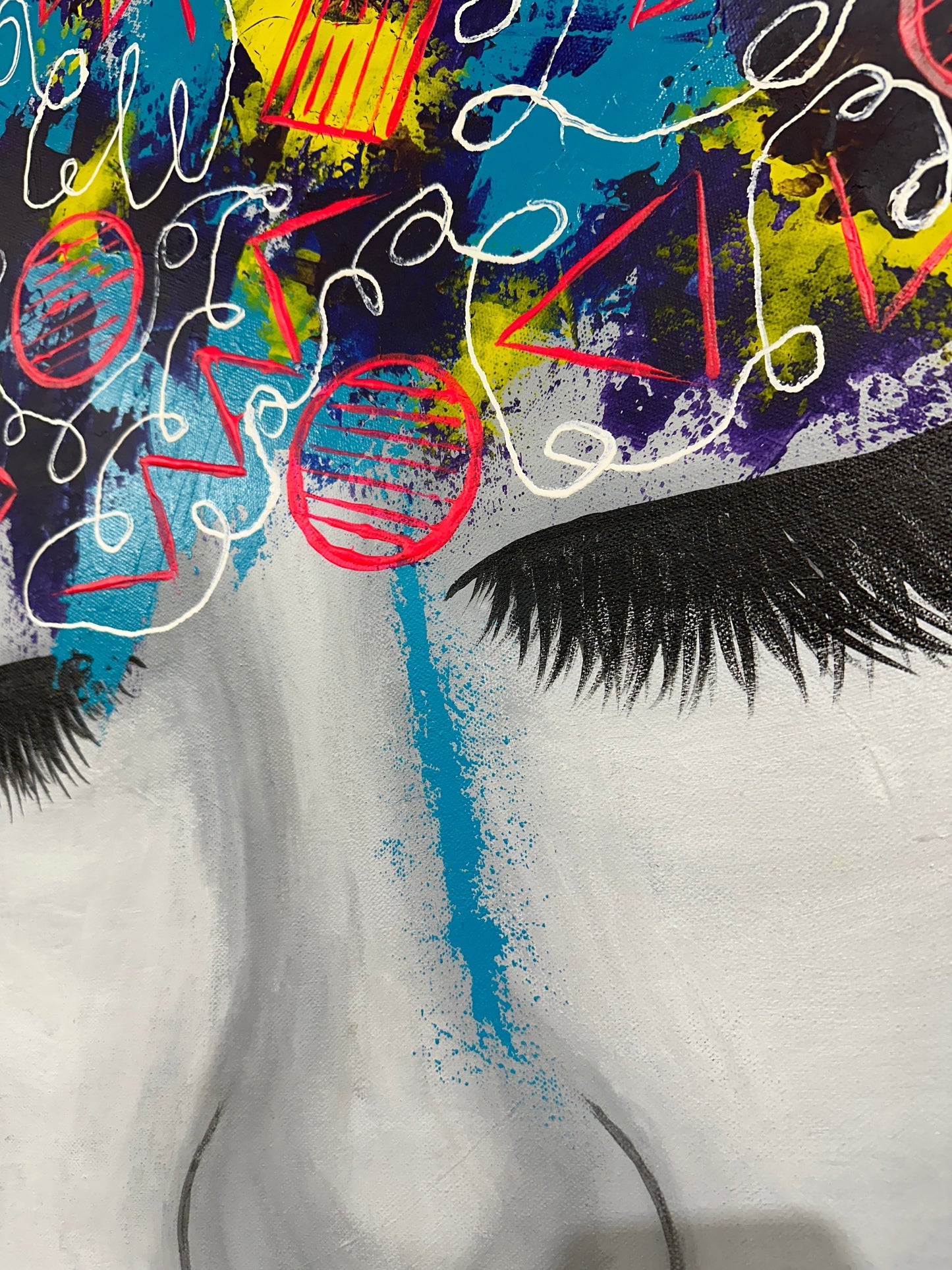 This piece presents a close-up of a woman's face, focused on her closed eyes and full lips, against a chaotic backdrop of vibrant, abstract graffiti.