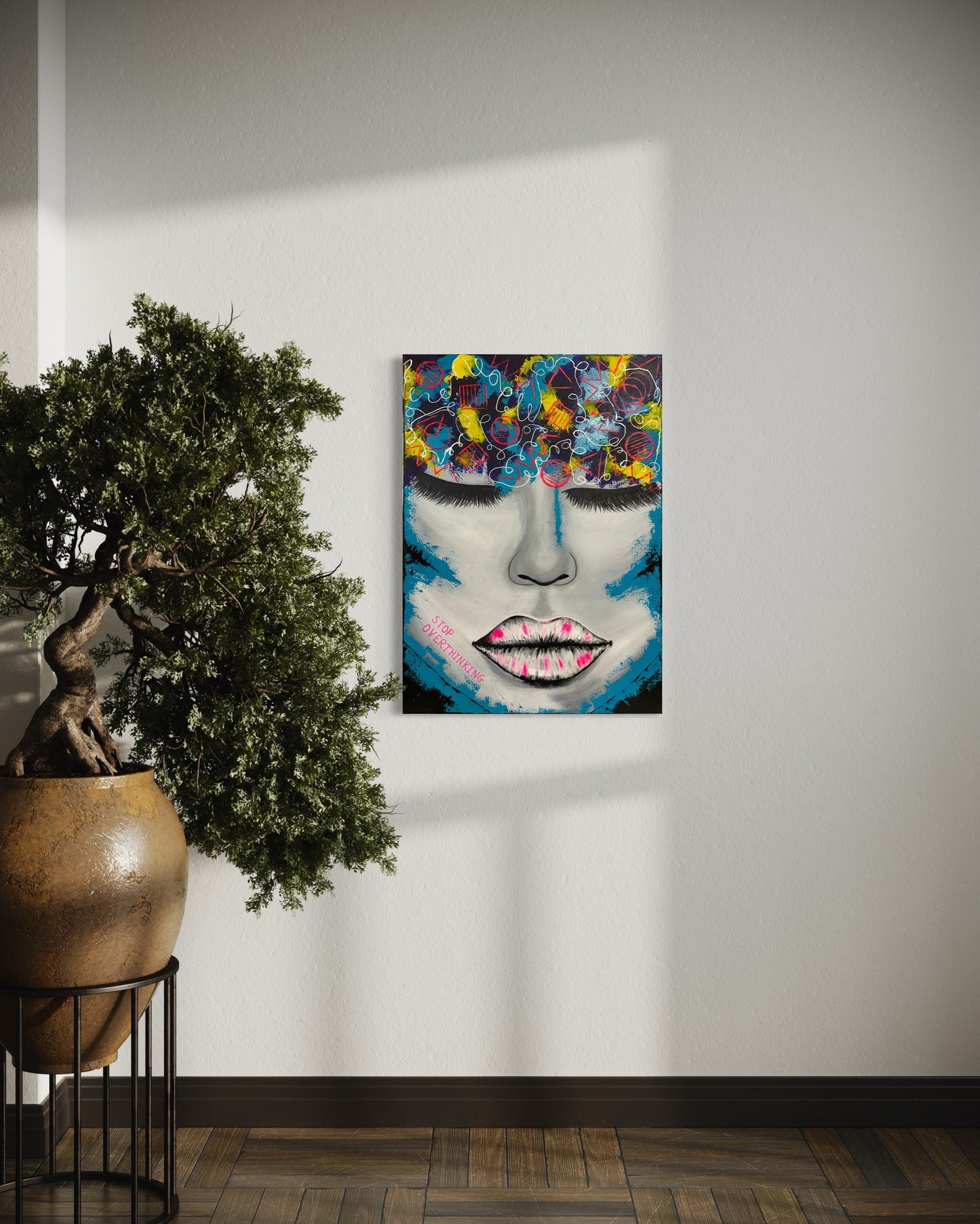 The contrast between the calm, monochromatic face and the energetic, colorful symbols swirling above her head illustrates the theme of overthinking, as explicitly stated by the words "STOP OVERTHINKING" written along her cheek, suggesting a struggle between inner peace and mental clutter.
