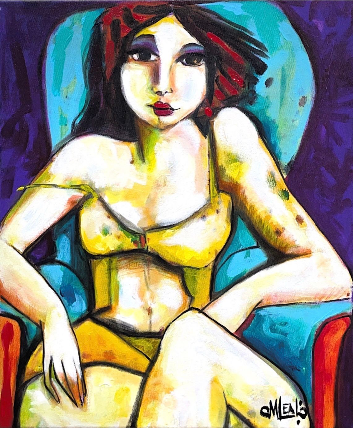 A vibrant portrait of a woman sitting in a blue-green chair. She wears a yellow dress, with brown hair cascading over her shoulders. Her expression is soft and contemplative, with vivid colors and expressive features showing a cubist influence.
