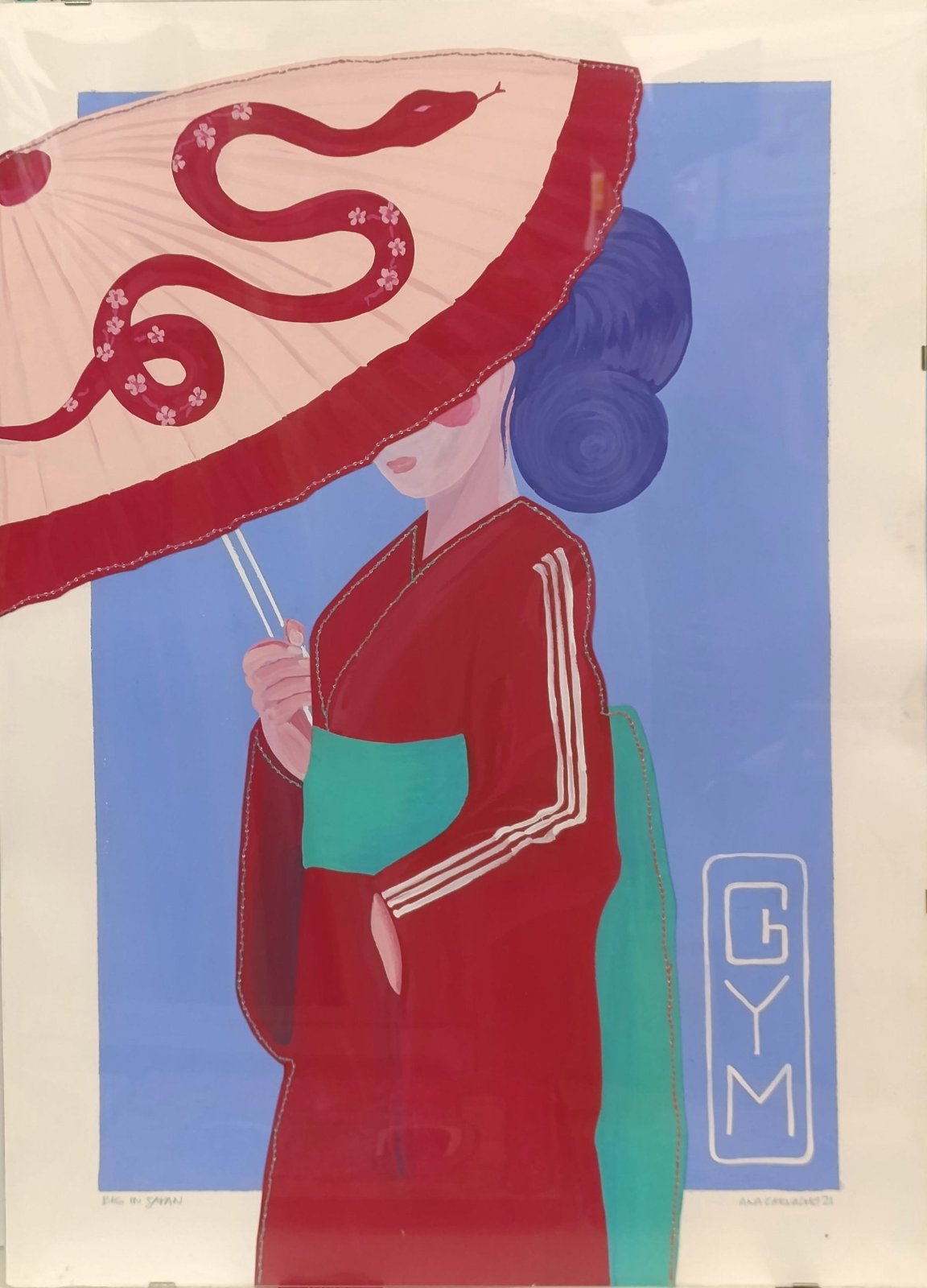This unique painting blends traditional and contemporary elements, portraying a geisha with a striking modern twist. Dressed in a kimono with sporty accents and holding a parasol adorned with a bold snake design, the figure stands out against a minimalist background. The artist’s clever fusion of cultural motifs and modern fashion creates a playful yet sophisticated piece that celebrates both tradition and modernity. Perfect for adding a touch of edgy elegance to any space, this artwork is a must-have for those who appreciate cultural crossovers and contemporary art.