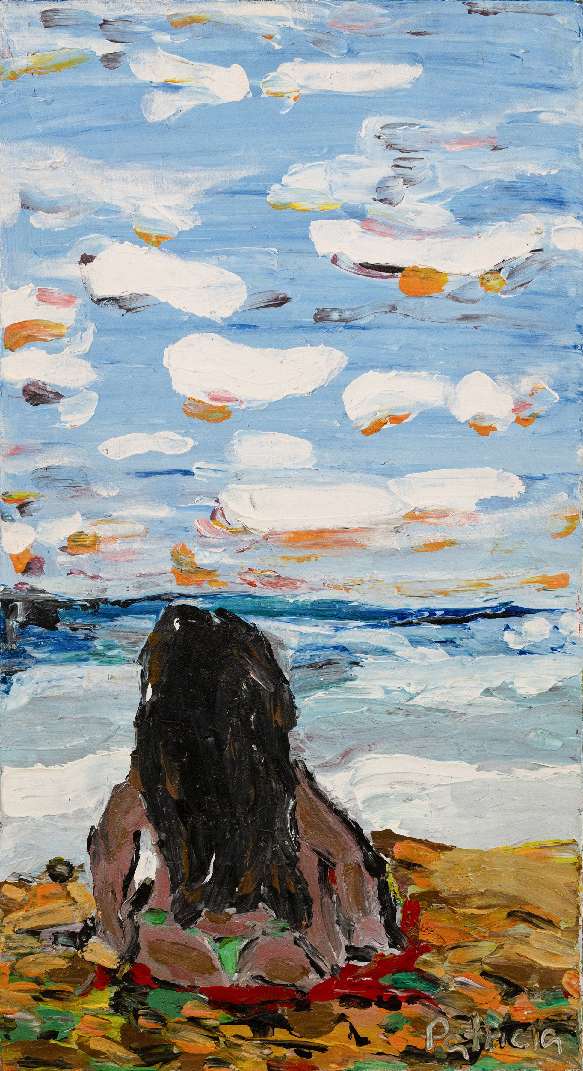A serene and contemplative view of the beach, with textured brushstrokes that bring the scene to life. The solitary figure gazing at the ocean evokes a sense of peace and introspection.