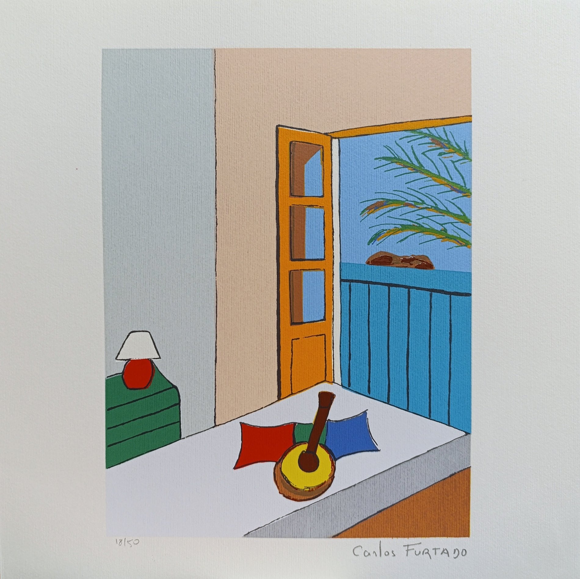 Morning Breeze presents a serene room where a guitar and a colorful pillow rest on a simple bed, while an open door invites the fresh ocean air. Through the door, palm trees sway, and a distant island rests on the horizon. The composition evokes tranquility and the charm of a peaceful morning by the sea. The minimalist yet vibrant color palette brings warmth and joy, making it a perfect addition to spaces seeking a calm, coastal vibe.