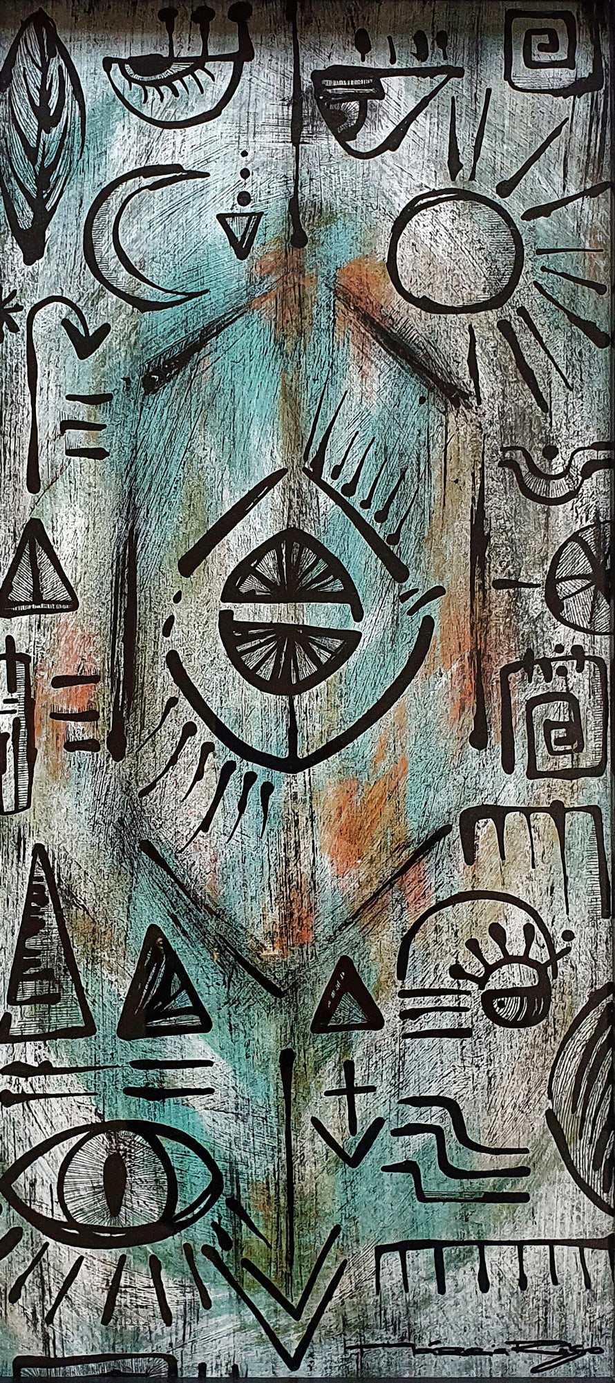 This artwork features an array of primitive and abstract symbols, creating a cryptic tapestry of forms and shapes. Each symbol seems to carry its own weight and story, inviting interpretation from the viewer.