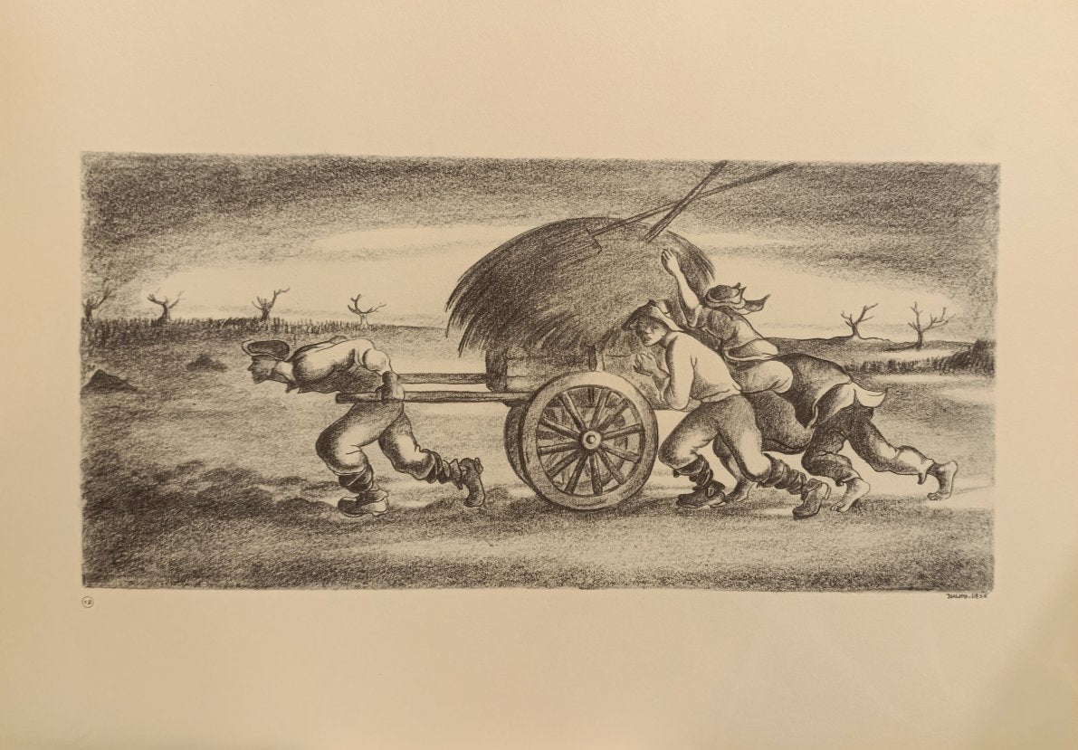 The composition captures the harsh, barren landscape in the background, with leafless trees that hint at the difficult conditions of the environment. Despite the toil, there is a sense of camaraderie and shared effort among the workers, their movements synchronized as they work together to move the cart forward. The scene serves as a testament to human endurance and the collective strength of individuals united in a common task.