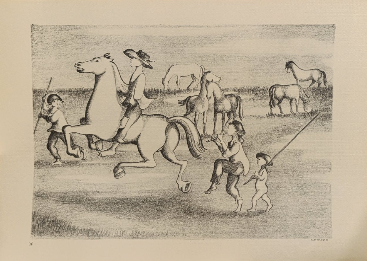 The artist captures the serenity of the rural environment, where horses graze peacefully in the background. The simplicity of the drawing, with gentle lines and soft shading, emphasizes the harmony between the children and their surroundings. This composition speaks to the innocence of youth and the timeless connection between humans and nature.