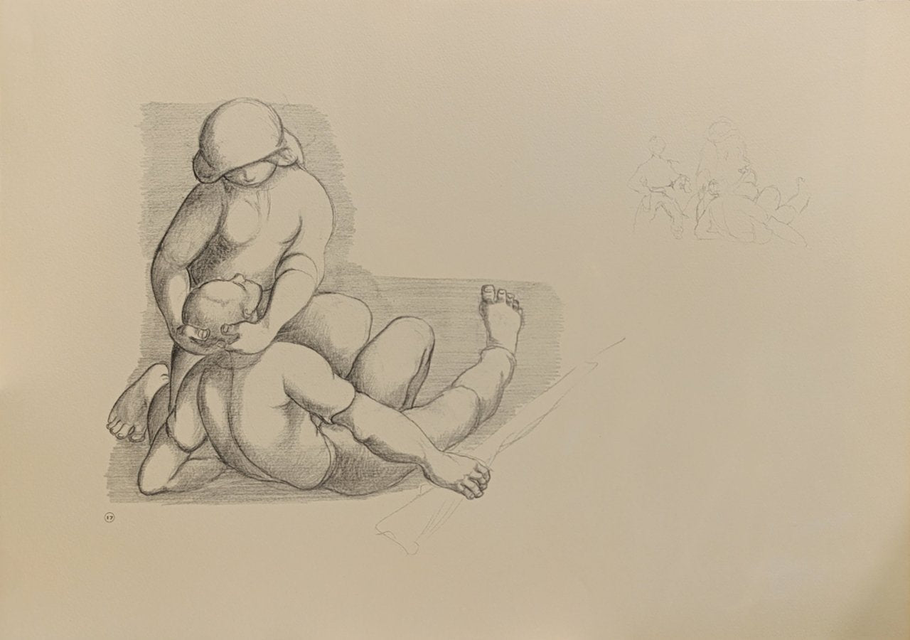 The soft, rounded forms of the figures, combined with the delicate shading, convey a sense of warmth and human connection. The larger figure’s hands gently cradle the head of the other, evoking a feeling of protection and care. The minimalist background draws attention to the closeness between the figures, emphasizing the emotional depth of the scene. A faint sketch in the corner hints at this theme of care, possibly suggesting the continuation of a nurturing bond.