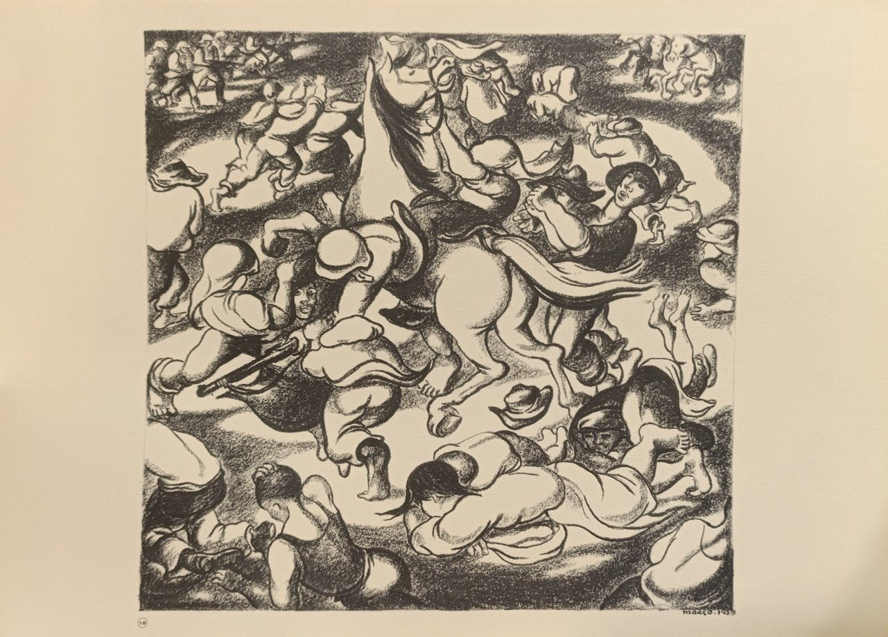 The intensity of the battle is captured through the swirling composition, where bodies and horses overlap, evoking a sense of movement and violence. The monochromatic tones, combined with the expressive lines, heighten the emotional impact of the piece. The contrast between the force of the mounted figures and the vulnerability of those on the ground highlights the brutality of war and the human cost involved.