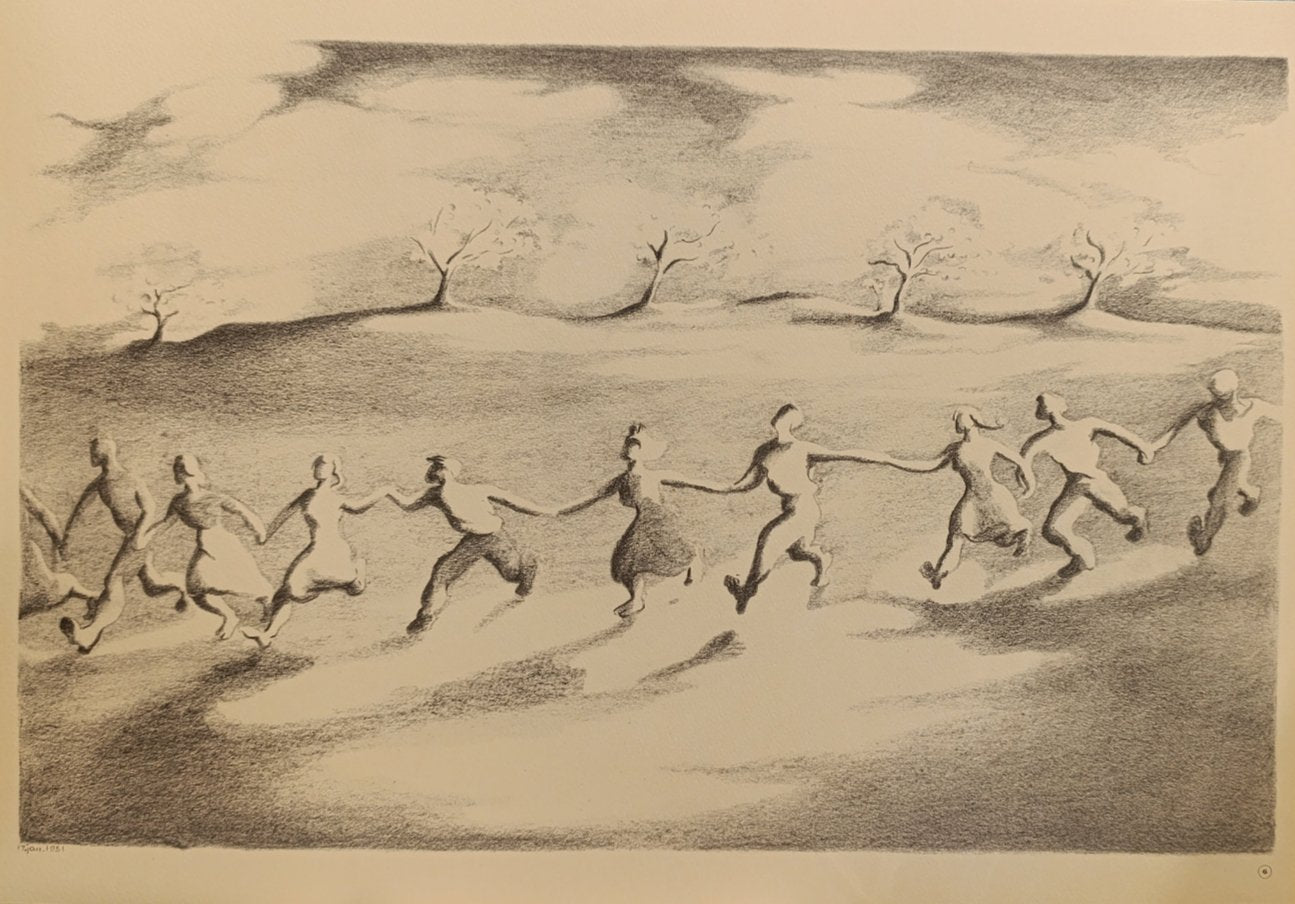 The figures, sketched with flowing, dynamic lines, seem to float across a barren landscape under a vast sky. The simplicity of the setting allows the focus to rest on the dancers, whose movements symbolize togetherness, freedom, and celebration of life. The use of light and shadow gives the figures depth, and their interlinked hands highlight the importance of connection and unity. The rhythmic energy in the piece evokes a sense of harmony with nature and with each other.