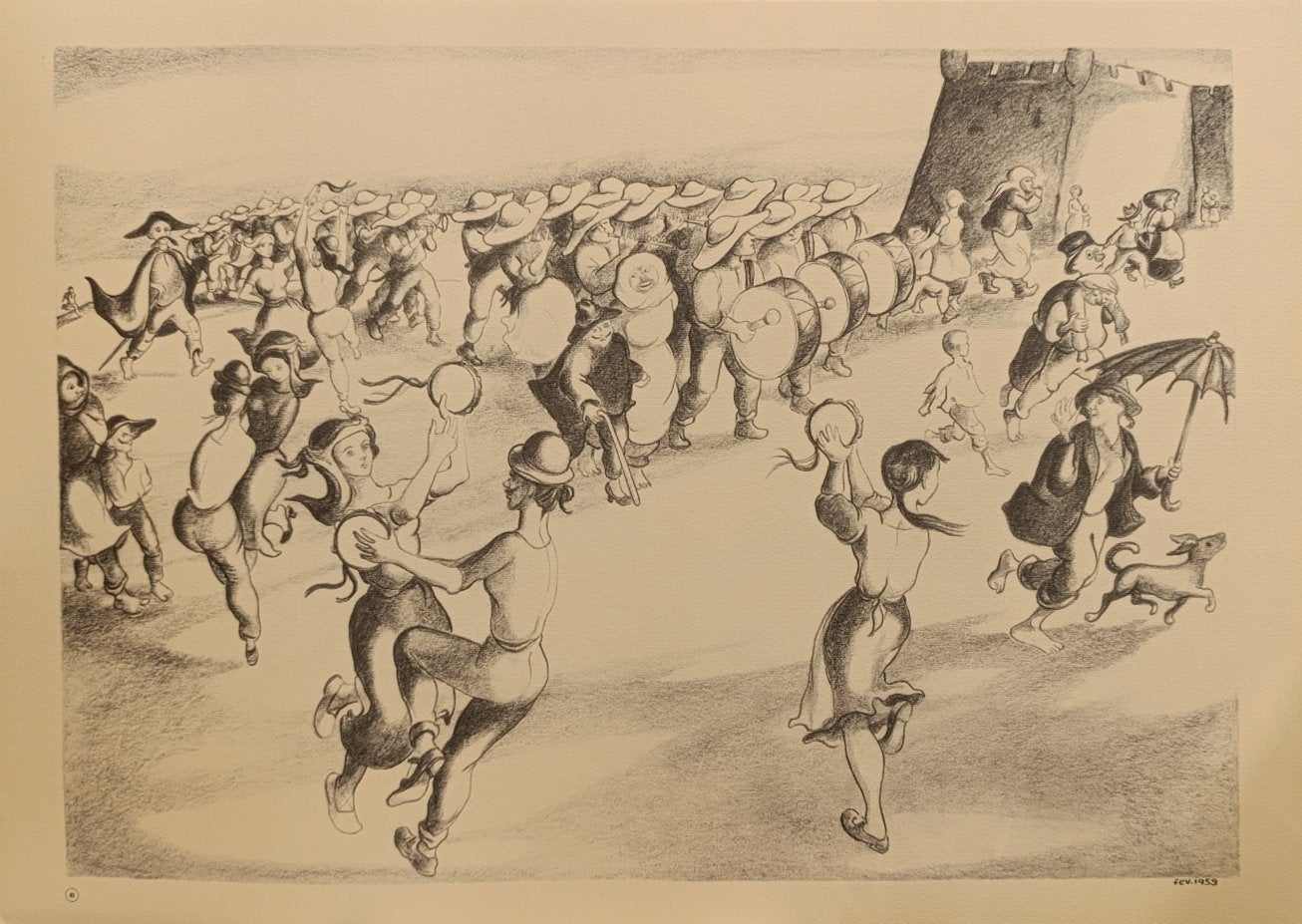 The foreground features dancers joyfully twirling, clapping tambourines, and moving to the rhythm, while a marching band, dressed in traditional hats, plays drums in the background. The sense of community and festivity is palpable as people of all ages participate, some holding umbrellas or watching with delight. A small dog even adds to the playful atmosphere. The detailed figures and sweeping composition capture the exuberance of the parade, celebrating unity and tradition.