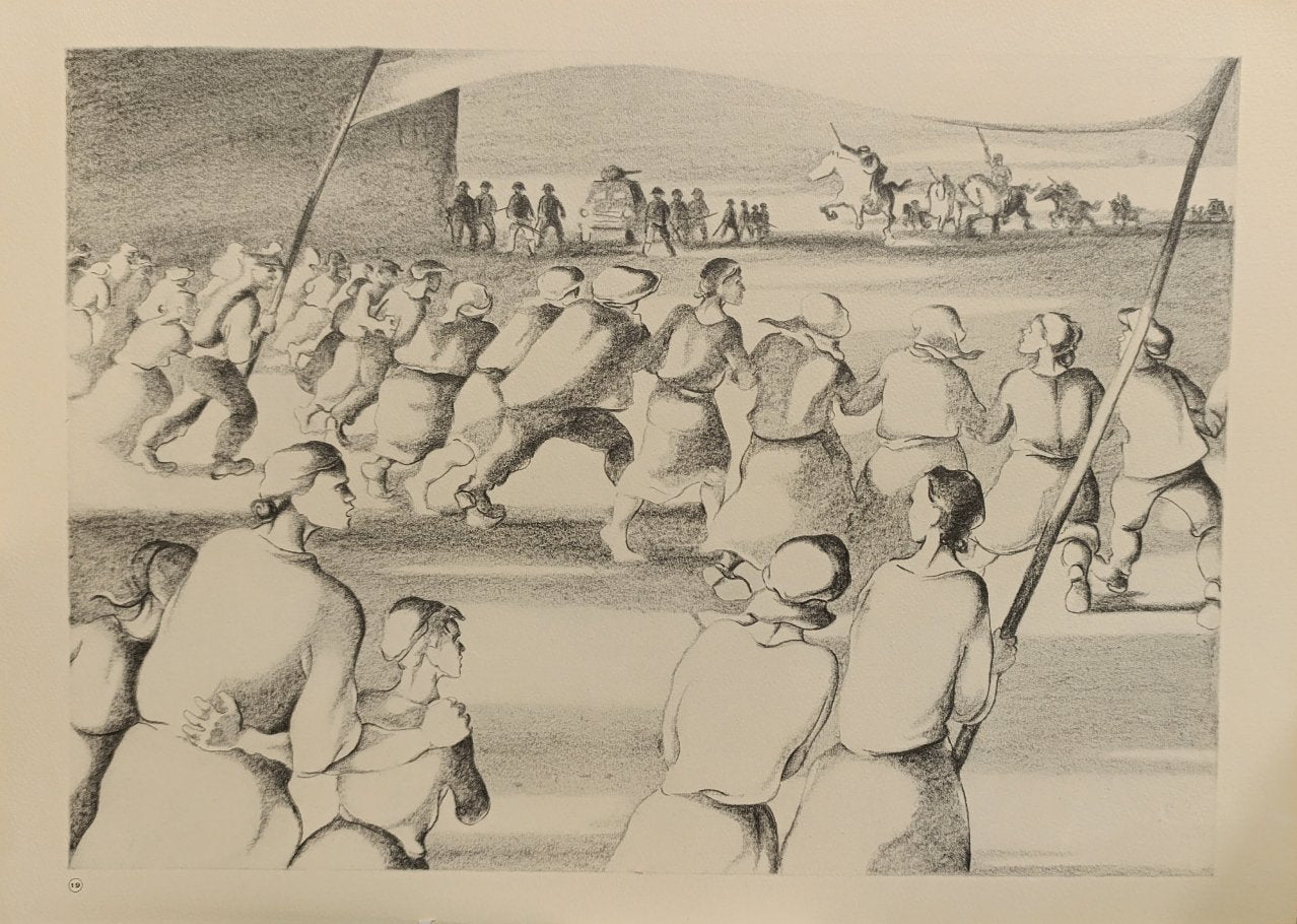 The figures are rendered in strong, flowing lines, evoking the power of collective action. The banner that they carry underscores their purpose, while the soft, shaded landscape contrasts with the determined energy of the people. The composition exudes a sense of momentum and shared struggle, with the figures moving forward in solidarity.