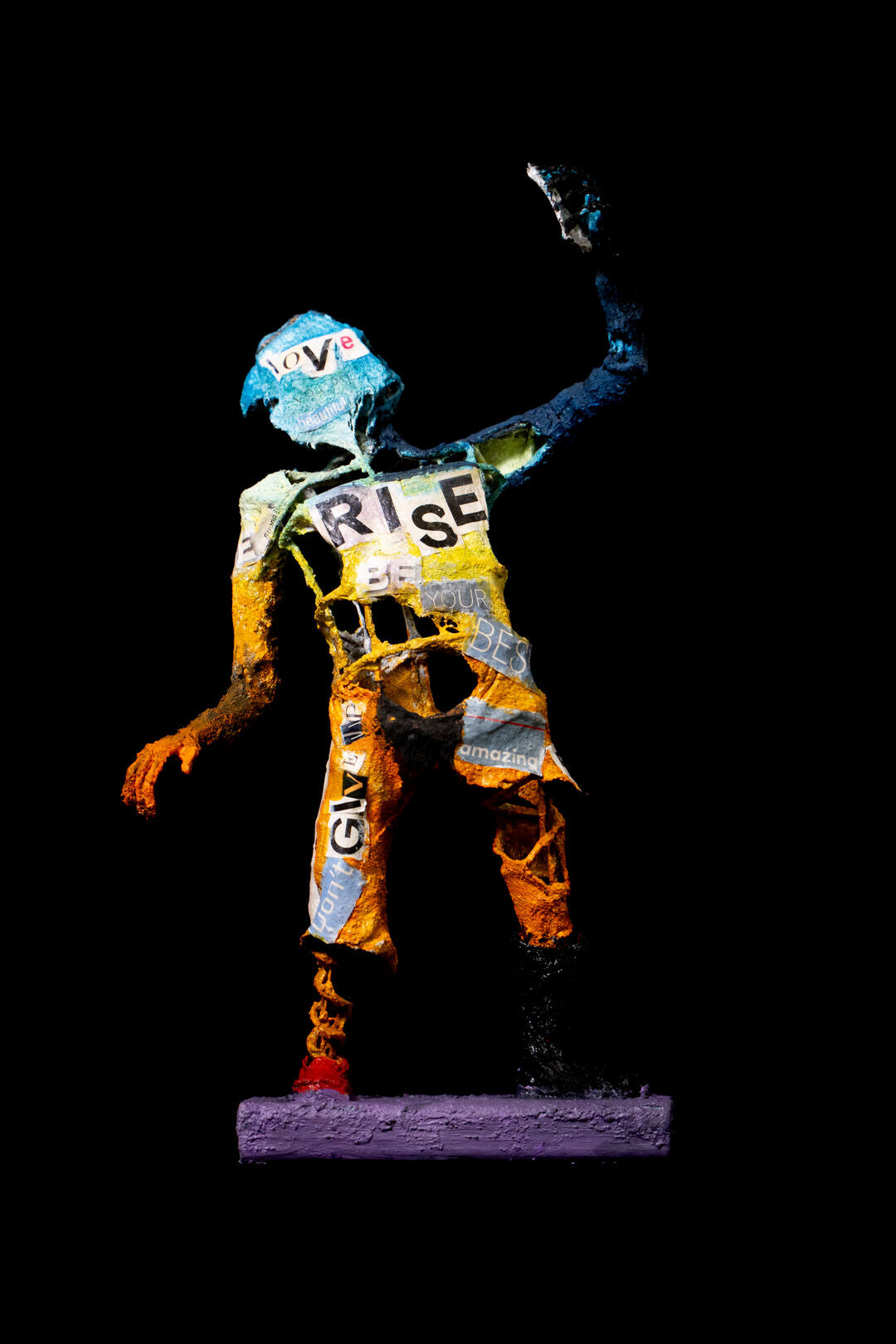 A thought-provoking sculpture that embodies the spirit of self-empowerment and positivity. The figure, painted in dynamic hues of blue, orange, and yellow, is adorned with inspiring words like “LOVE,” “RISE,” “BE YOUR BEST,” and “GIVE.” These uplifting messages, collaged onto the sculpture, transform it into a symbol of resilience and growth. The figure’s pose, with one arm reaching upward, suggests aspiration and hope, while the fragmented, textured surface reflects the journey of self-discovery and transformation. Set against a stark black background, the colors and messages stand out boldly, inviting viewers to connect with themes of motivation, self-worth, and the power of positivity.