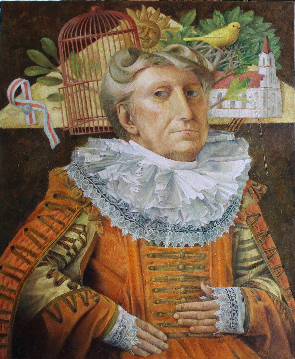 A richly hued, Renaissance-inspired portrait of a noble figure in ornate attire, juxtaposed with a birdcage and a bright canary perched outside.