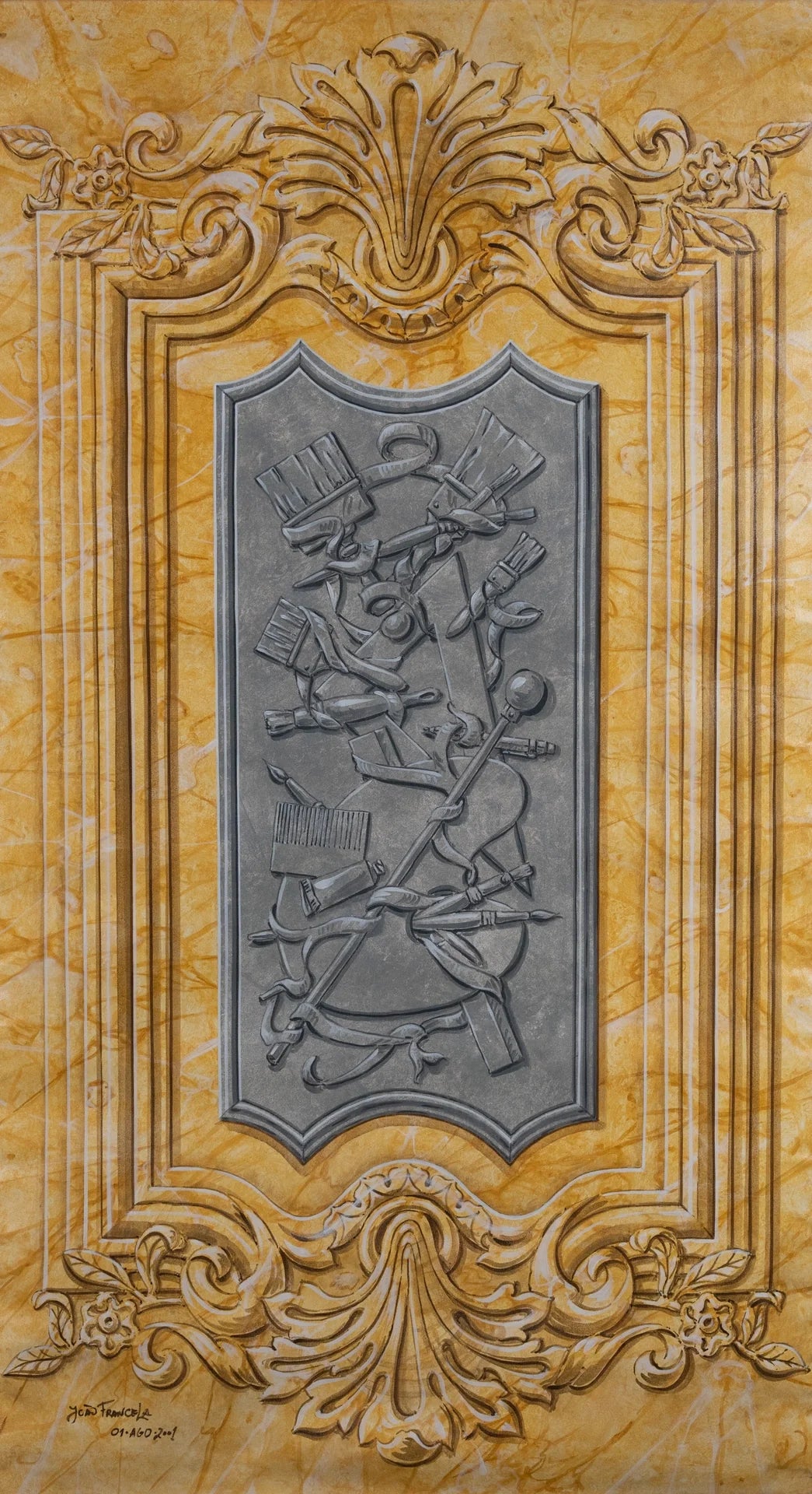 In this painting, João Francela, a master of art deco, shows his expertise reproducing trompe-l'oeil on canvas.