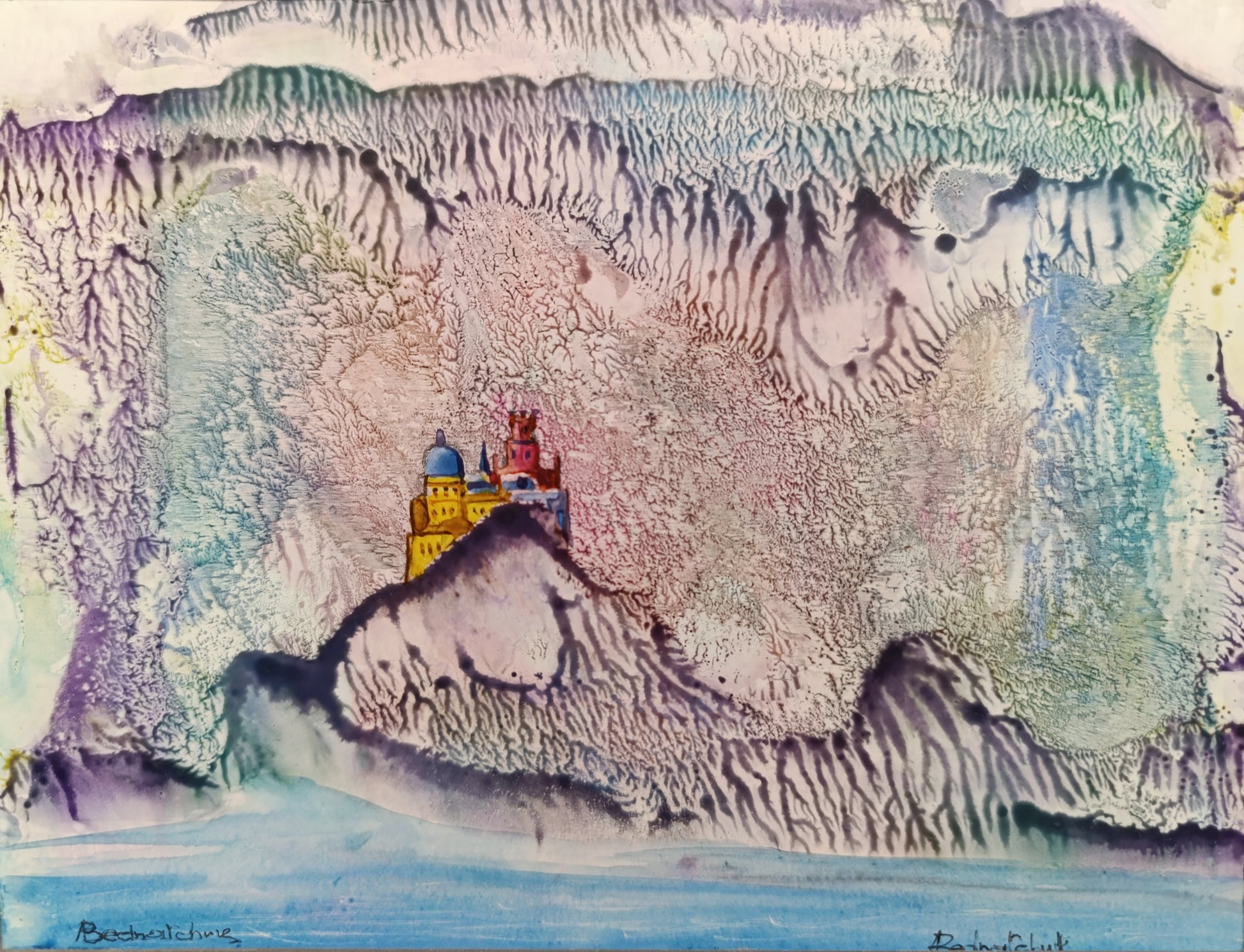 Ethereal charm of Pena Palace amid the lush Sintra forest. The painting depicts the vibrant, whimsical architecture of the palace, with its distinctive colors and intricate details blending harmoniously into the surrounding forest.