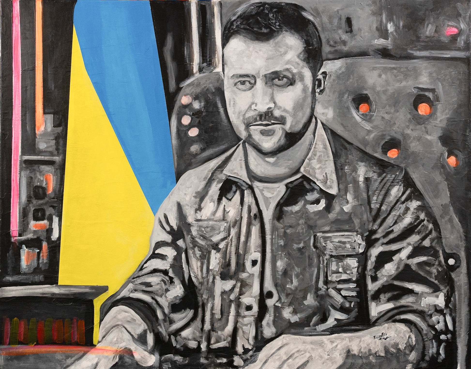 A powerful, monochromatic portrait of a modern leader, set against a backdrop of national colors. The painting captures the determination and strength of character in the leader's expression.