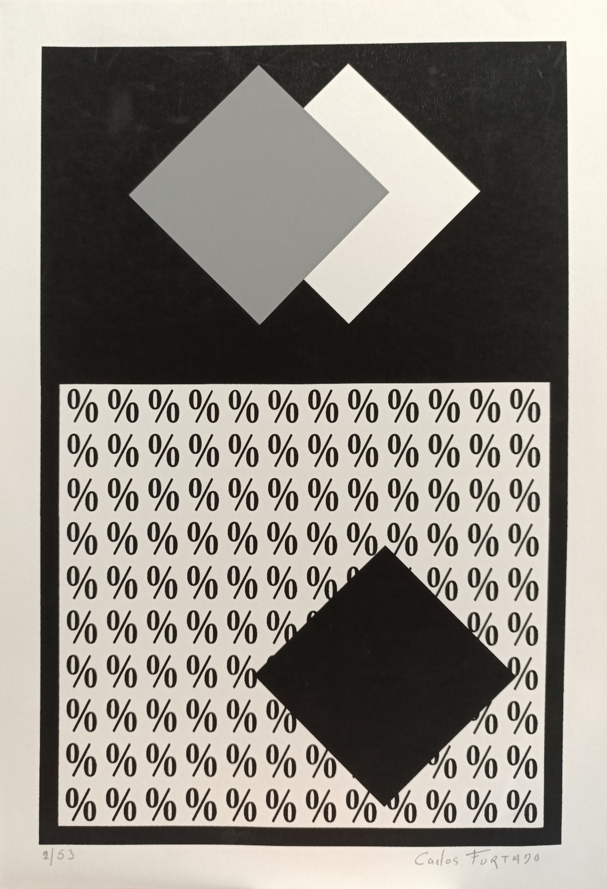 This artwork juxtaposes the repetitiveness of the "%" symbol against a backdrop of geometric shapes, creating a dialogue between mathematical concepts and abstract design. The interplay of grayscale and stark black and white forms contrasts with the organic repetition of the percentage sign, evoking thoughts on modern economies, statistics, and digital codes. The geometric alignment symbolizes precision, while the ubiquitous "%" symbol anchors the piece in a contemporary context.