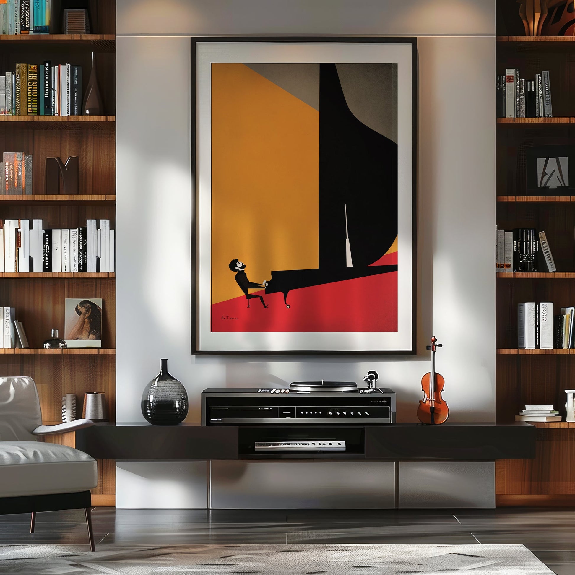 A minimalist and modern illustration depicting a pianist at a grand piano, whose form expands dramatically to dominate the composition. The background features bold geometric blocks of mustard yellow, red, and gray, creating a striking contrast with the black piano.