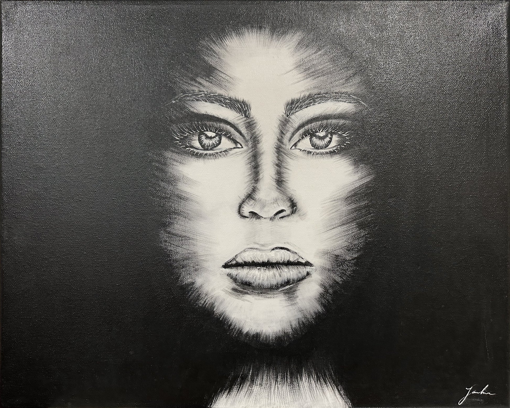 A black and white portrait of a face emerging from darkness, portrayed with lifelike detail. The central features—eyes, nose, and mouth—are rendered with sharp clarity against a fading, shadowy background that seems to both illuminate and obscure the face simultaneously, creating a sense of mystery and introspection.