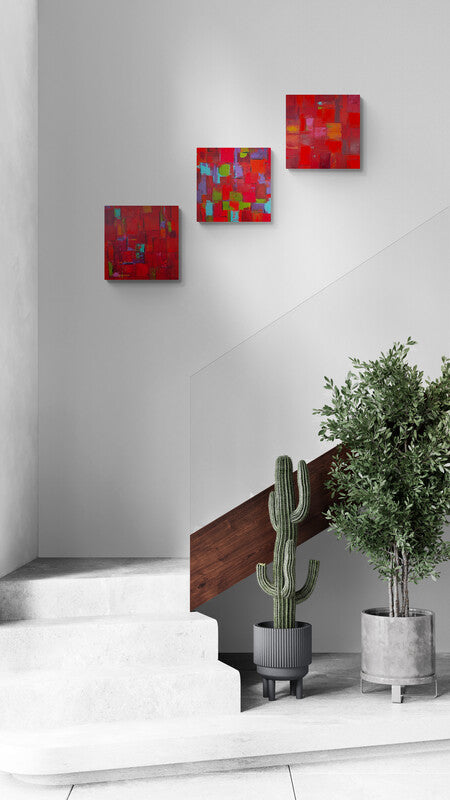 A bold and dynamic abstract painting dominated by rich red hues with accents of turquoise, purple, and orange. The textured layers and geometric patterns create a sense of depth and energy, evoking the intensity and passion of a glowing ember.