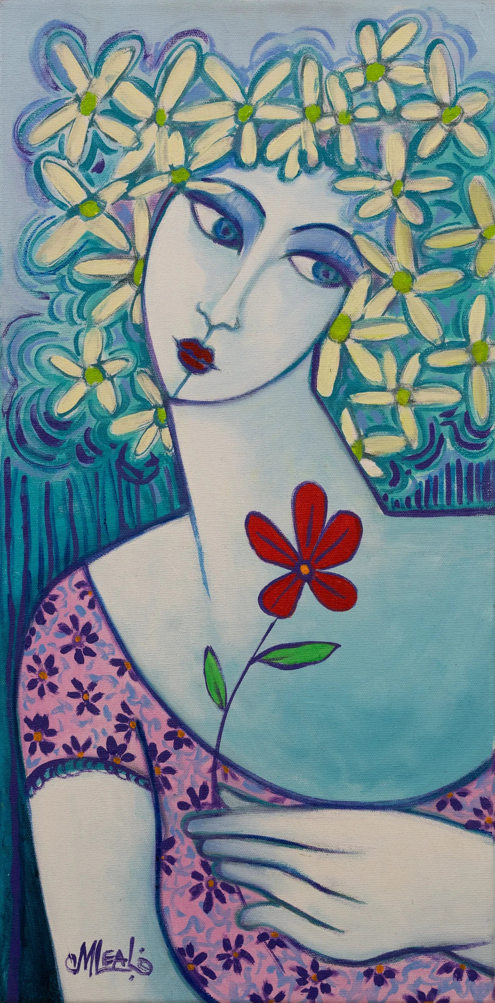 This painting depicts a female figure adorned with a headdress made of whimsical, stylized flowers.