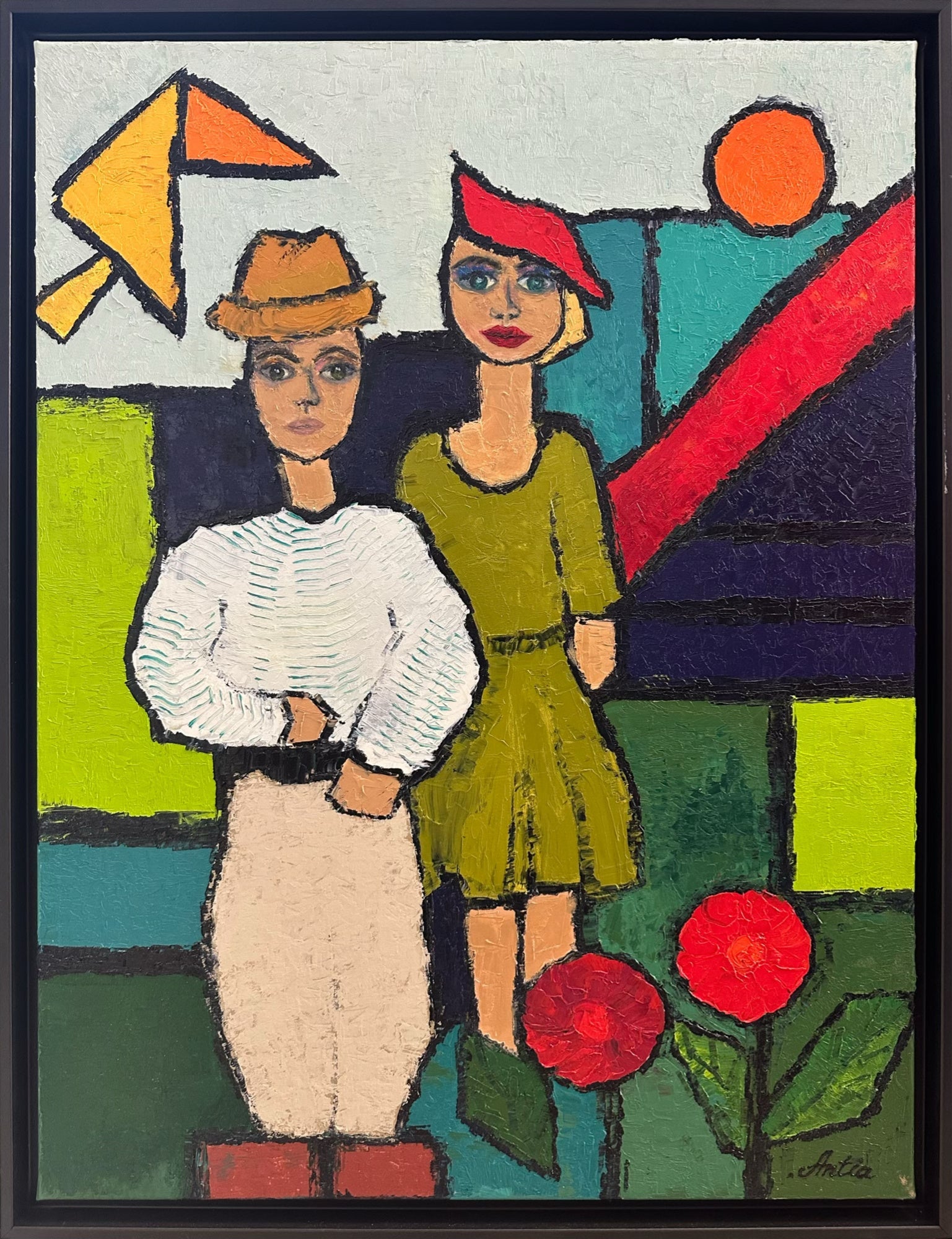 "Promenade" presents a bold and stylized depiction of a couple walking through a geometric landscape. Featuring simplified shapes, vibrant blocks of colour, and confident brushwork, the artwork conveys a sense of nostalgic innocence and quiet companionship.