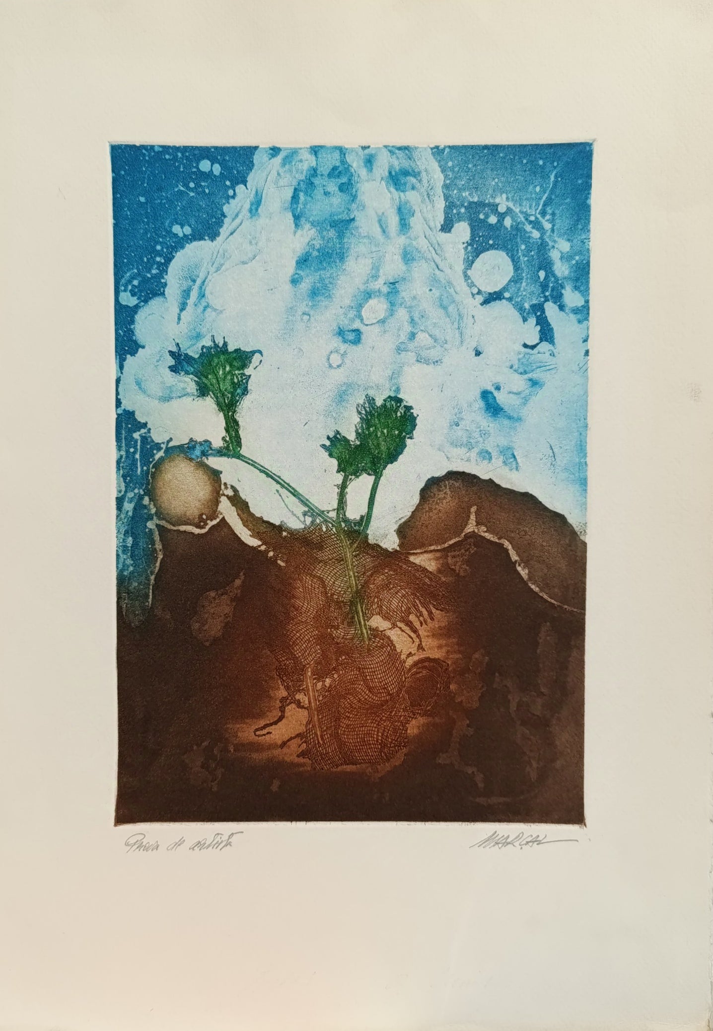 With a focus on the contrast between earthly roots and surreal sky elements, the piece depicts plant roots stretching through the soil, representing growth and nature's strength. The texture-rich brown tones of the earth juxtaposed against the swirling blues of the abstract sky create a dreamlike atmosphere. The depth and detail in the plant forms provide a delicate contrast to the flowing, ethereal background.