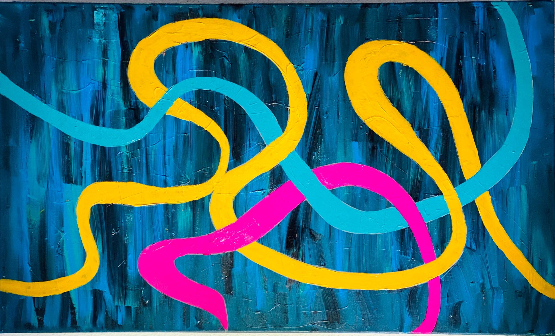 A dynamic surge of energy. “Pulse” captures the rhythm of movement, connection, and chaos with bold, intertwined lines in neon tones over a deep oceanic backdrop.