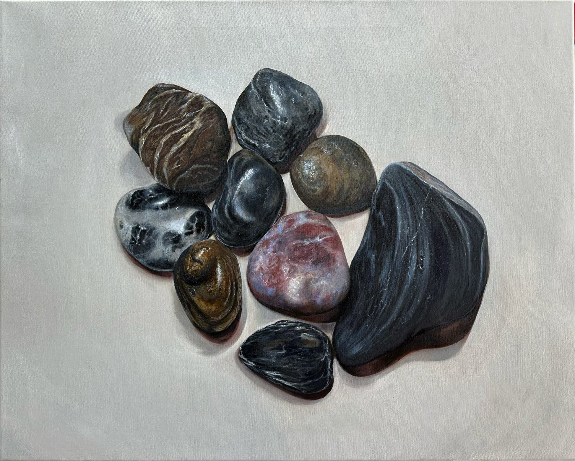This is a meditative collection of ocean-polished stones rendered with exquisite realism. Each rock tells a silent story through its texture, tone, and timeworn beauty, gathered together like fragments of memory suspended in stillness.