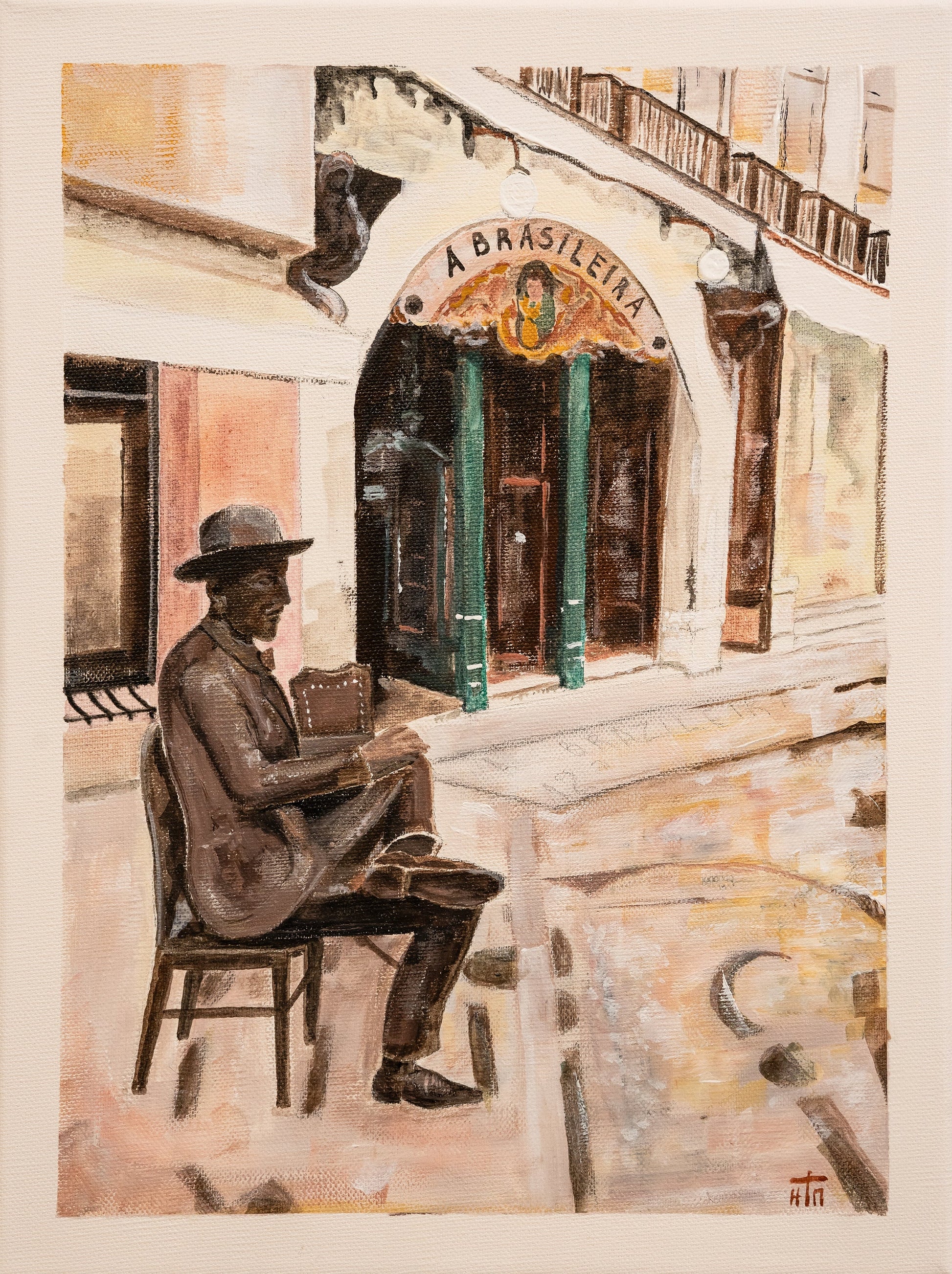 "Quiet Moment at A Brasileira" captures a serene scene outside the famous Lisbon café, A Brasileira. A lone figure, cloaked in a stylish suit and hat, sits immersed in his reading, oblivious to the bustling surroundings. The painting’s realistic style is marked by detailed brushwork and a soft, earthy palette, which highlights the historic charm of the location. This artwork invites viewers to ponder the stories held within the quiet moments of city life.