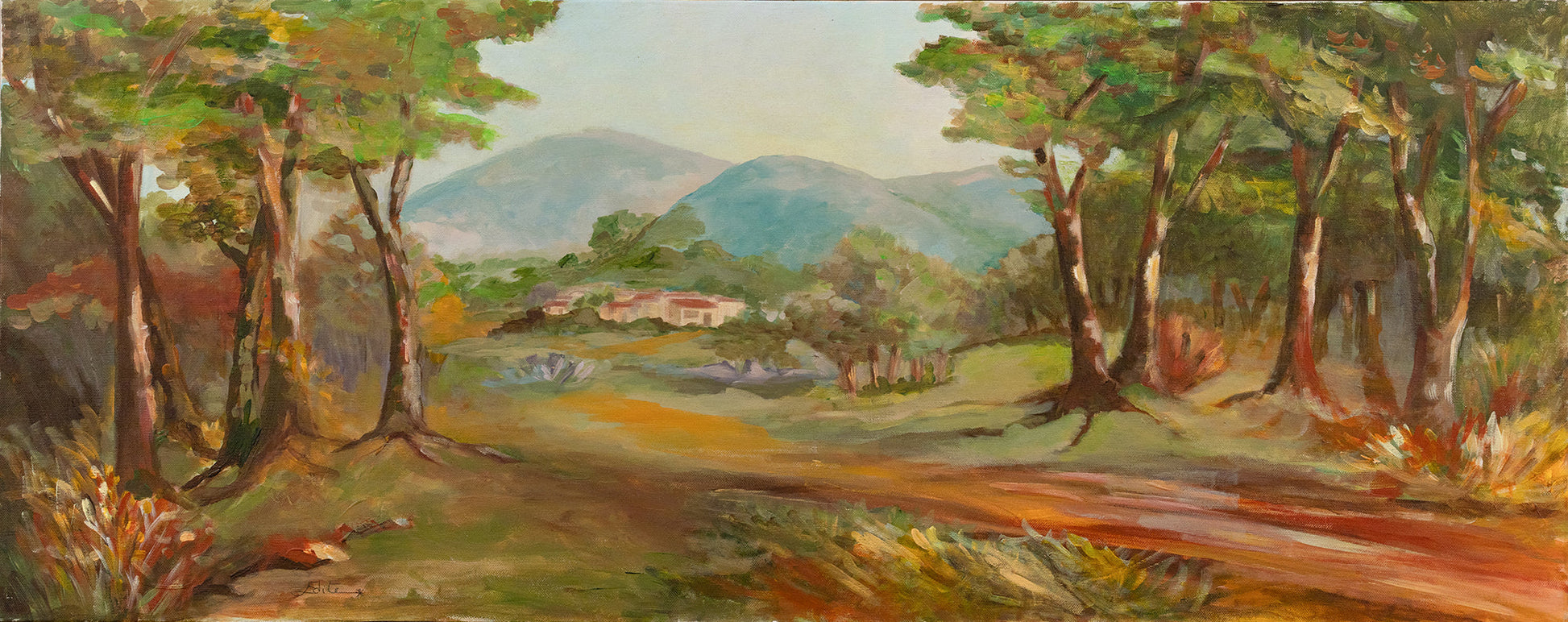 This landscape painting captures a serene forest scene bathed in warm, golden light. The pathway meanders through lush greenery, leading the viewer's eye towards the distant mountains. The soft, impressionistic brushstrokes and rich color palette create a tranquil and inviting atmosphere, evoking the peaceful beauty of nature.