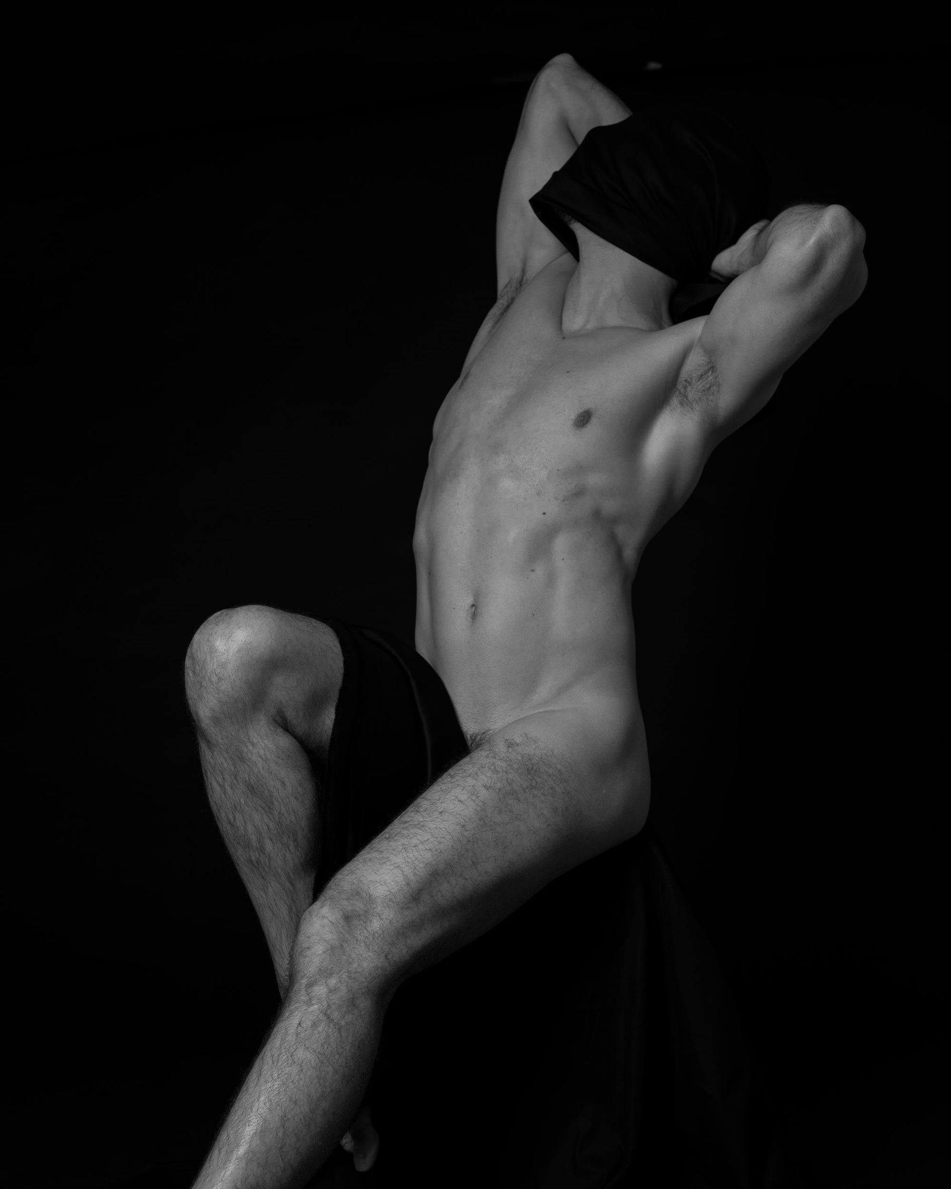Duda Breda captures the body in a moment of posed transcendence — or self-effacement. The figure, mid-kneel and shirt-veiled, stretches upward in a gesture at once proud and pained. The sharp anatomical detail of the torso and limbs suggests a studied mastery of the physical form. Yet the concealment of the face with a dark fabric reveals the contradiction at the core of the work: visibility without identity.