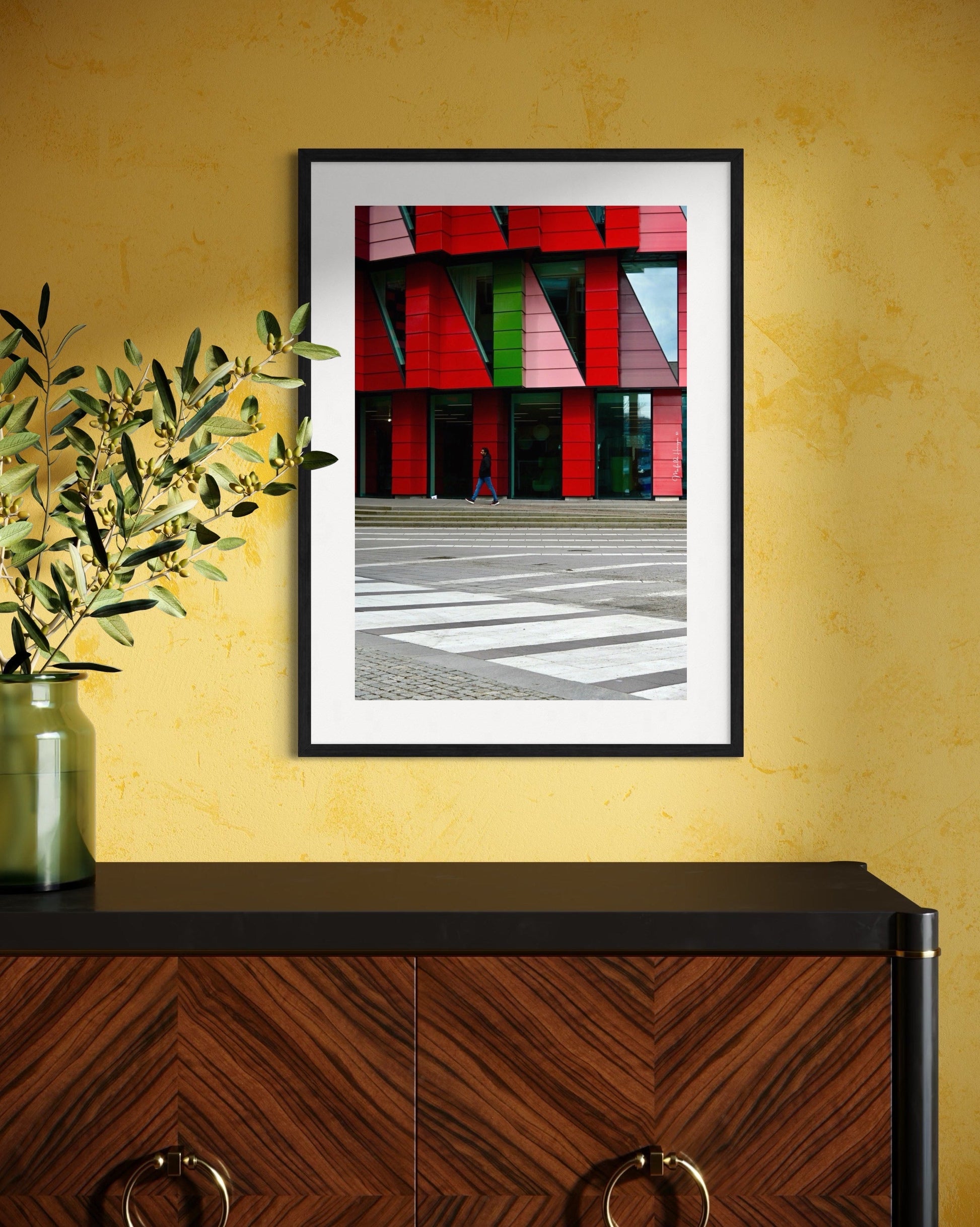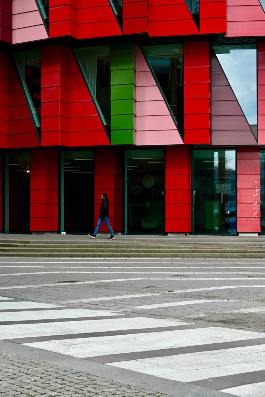In this image, a man walks slowly in front of a striking, modern building characterized by vibrant shades of red, contrasting with the calmness that envelops the scene. The building, round and with bold architecture, stands imposingly near the riverbank, reflecting the innovative spirit of Gothenburg, a city known for its harmonious blend of tradition and modernity.
