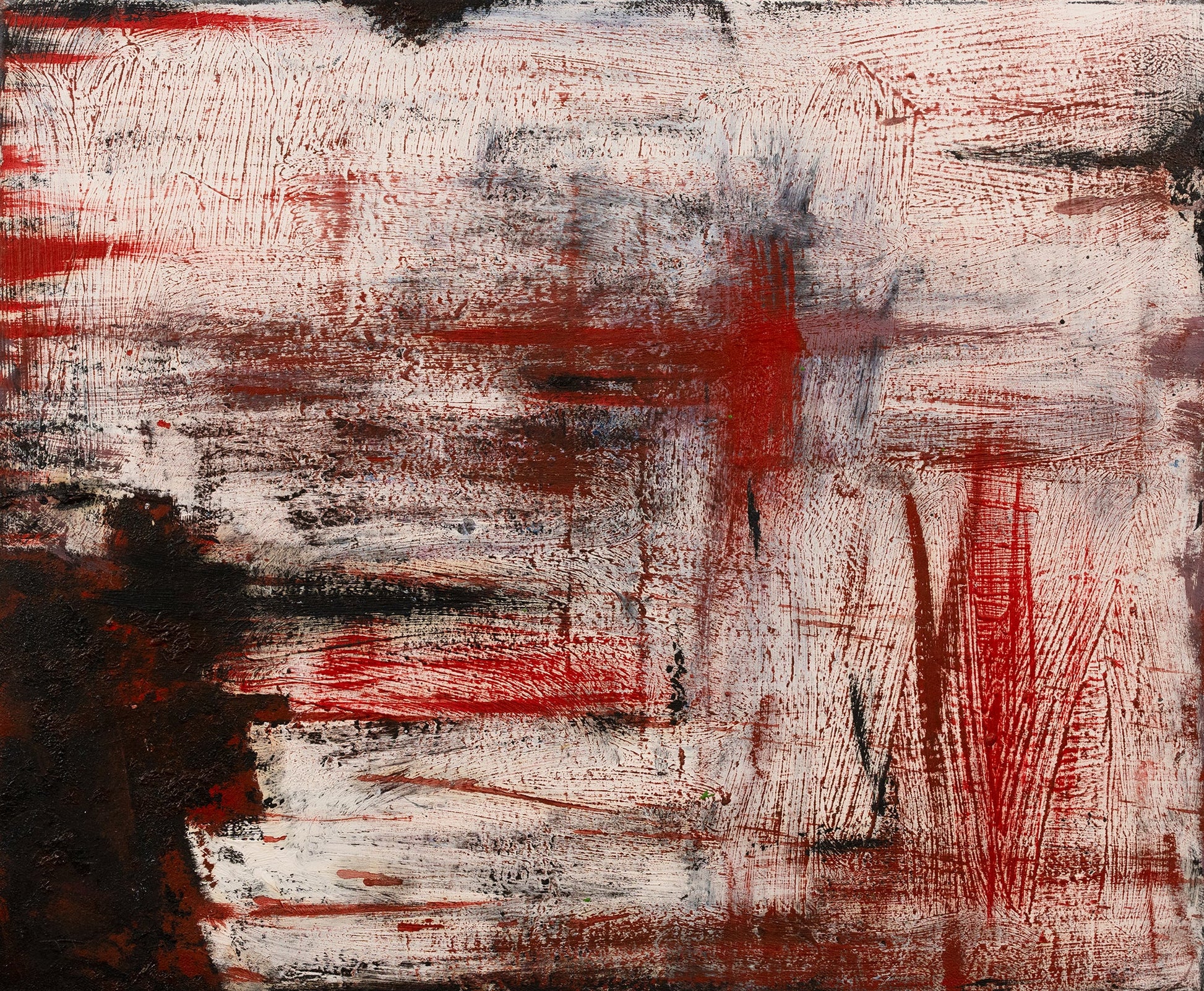 This abstract work features bold, textured red and black strokes on a white background. The contrast and raw energy in the composition suggest a visceral, emotional experience.