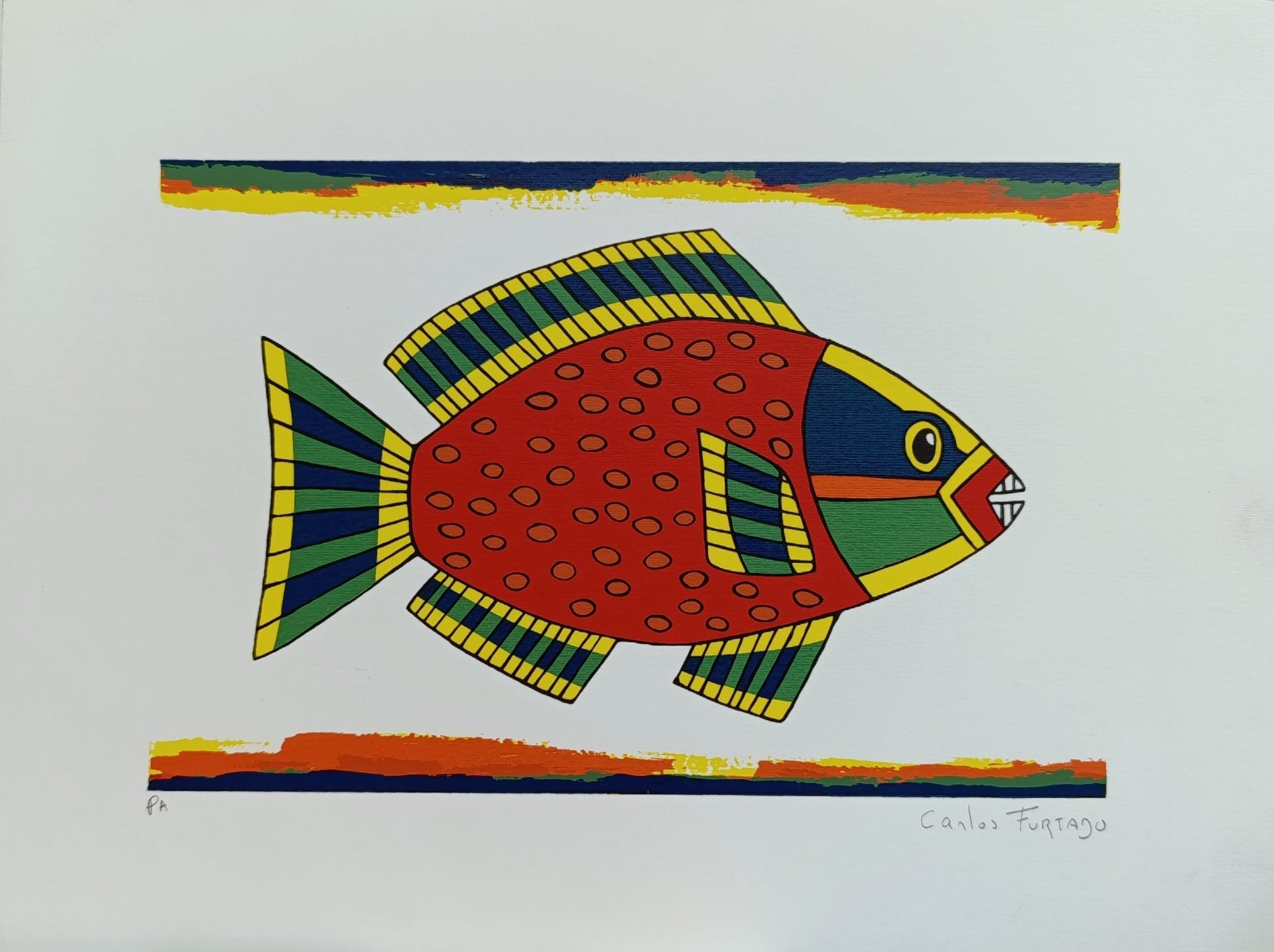 A vibrant and colorful fish against a bright, white background. The bold red body of the fish, covered in yellow polka dots, is accented by geometric shapes and striped fins in green, blue, and yellow. The abstract and playful design is framed by multicolored brush strokes, adding an extra touch of creativity and fun. This print would make a lively addition to any room, ideal for spaces that crave color and joy.