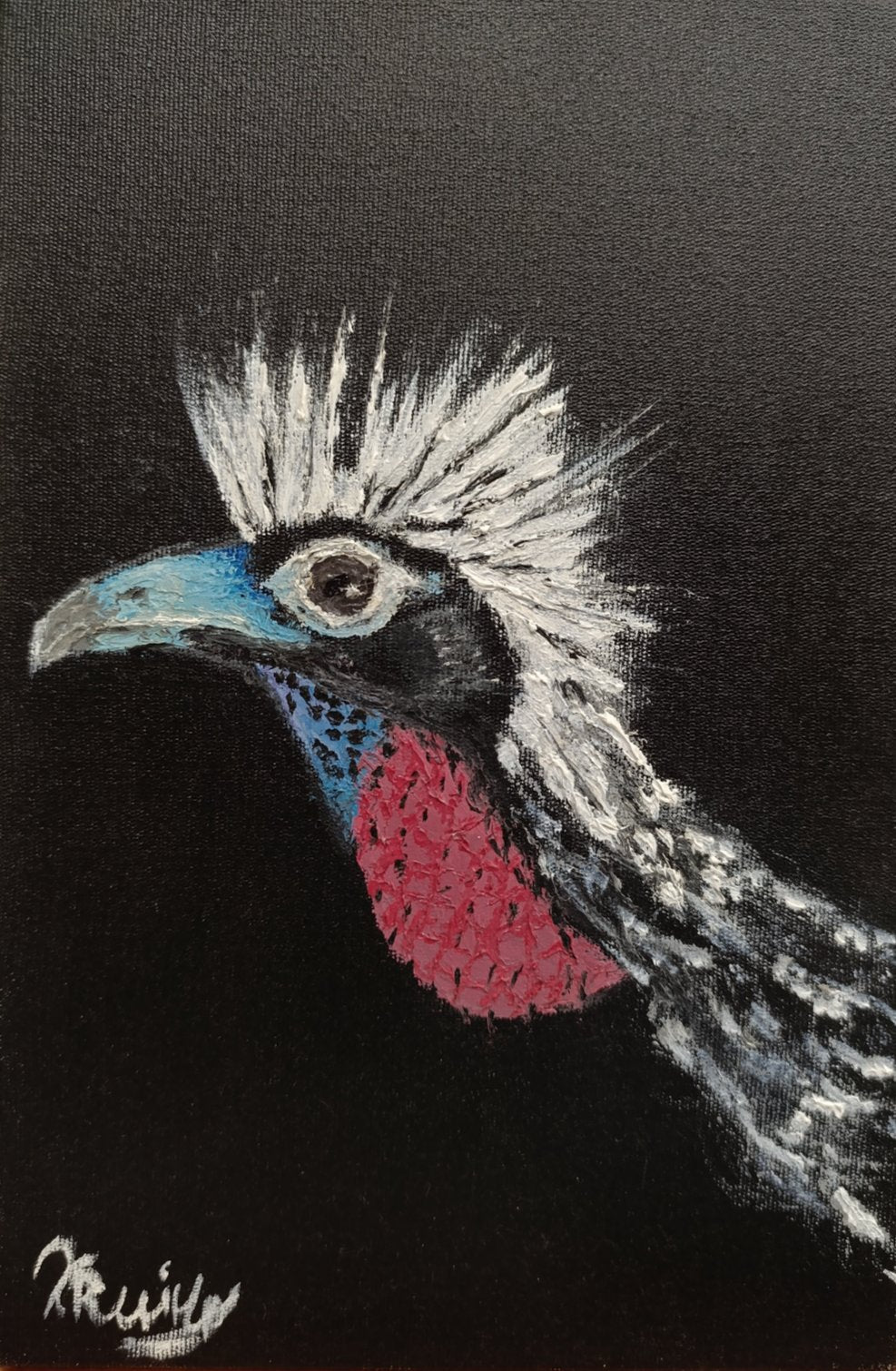 A bird rendered in vivid detail against a bold black background. The sharp contrast highlights the bird's unique features, particularly its striking blue beak, expressive eye, and the spiky white crest that gives it a regal and majestic appearance. The textured red and blue hues of the bird's neck add depth and character to the piece, creating a sense of individuality and pride in the subject. This painting celebrates the beauty of wildlife through an up-close, intimate view of the bird, bringing its vibrant energy to life.