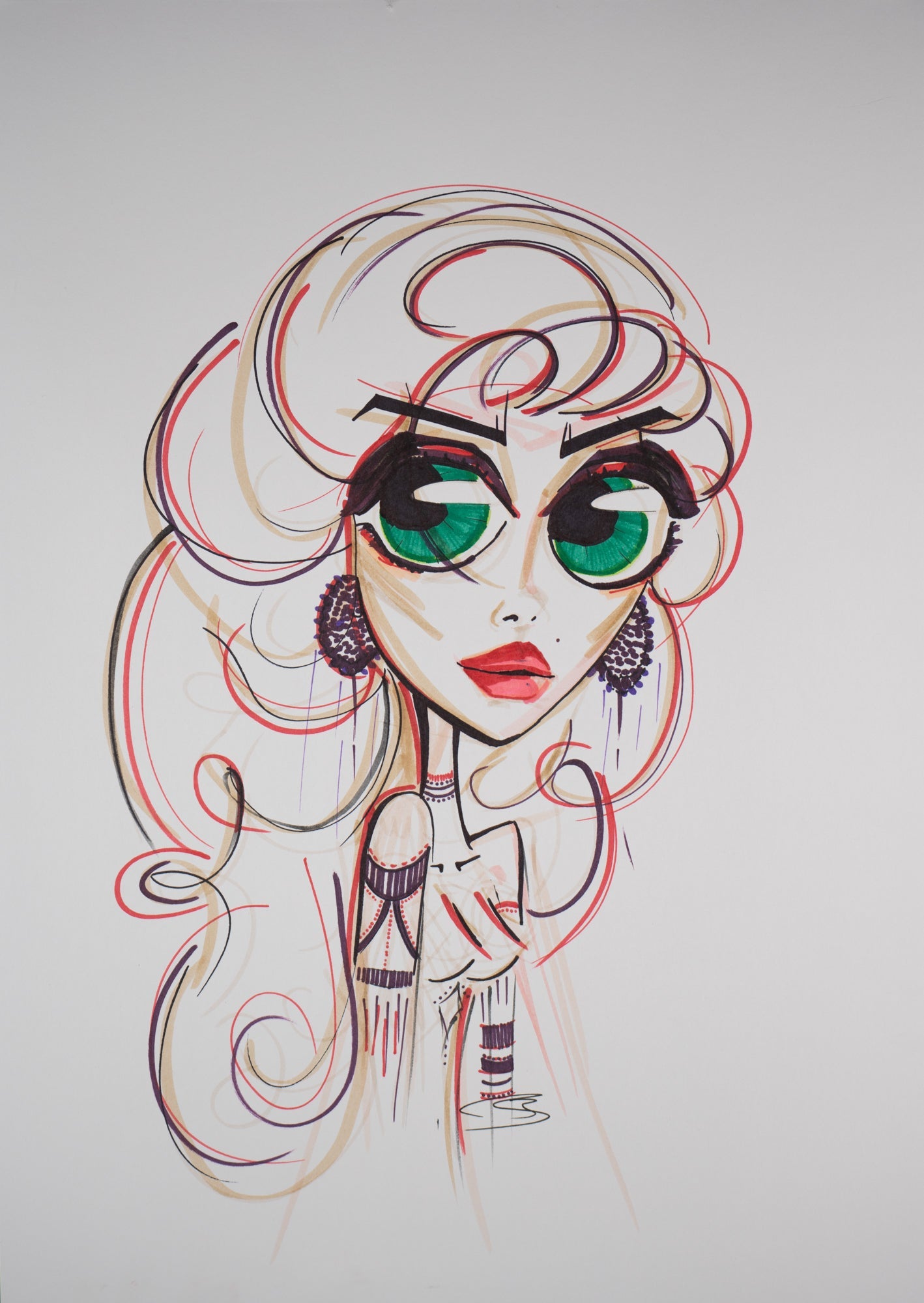 Her hair swirls with bold lines, her large green eyes are framed with thick black lashes, and her lips are painted a vibrant red, capturing a vintage aesthetic with a modern twist.