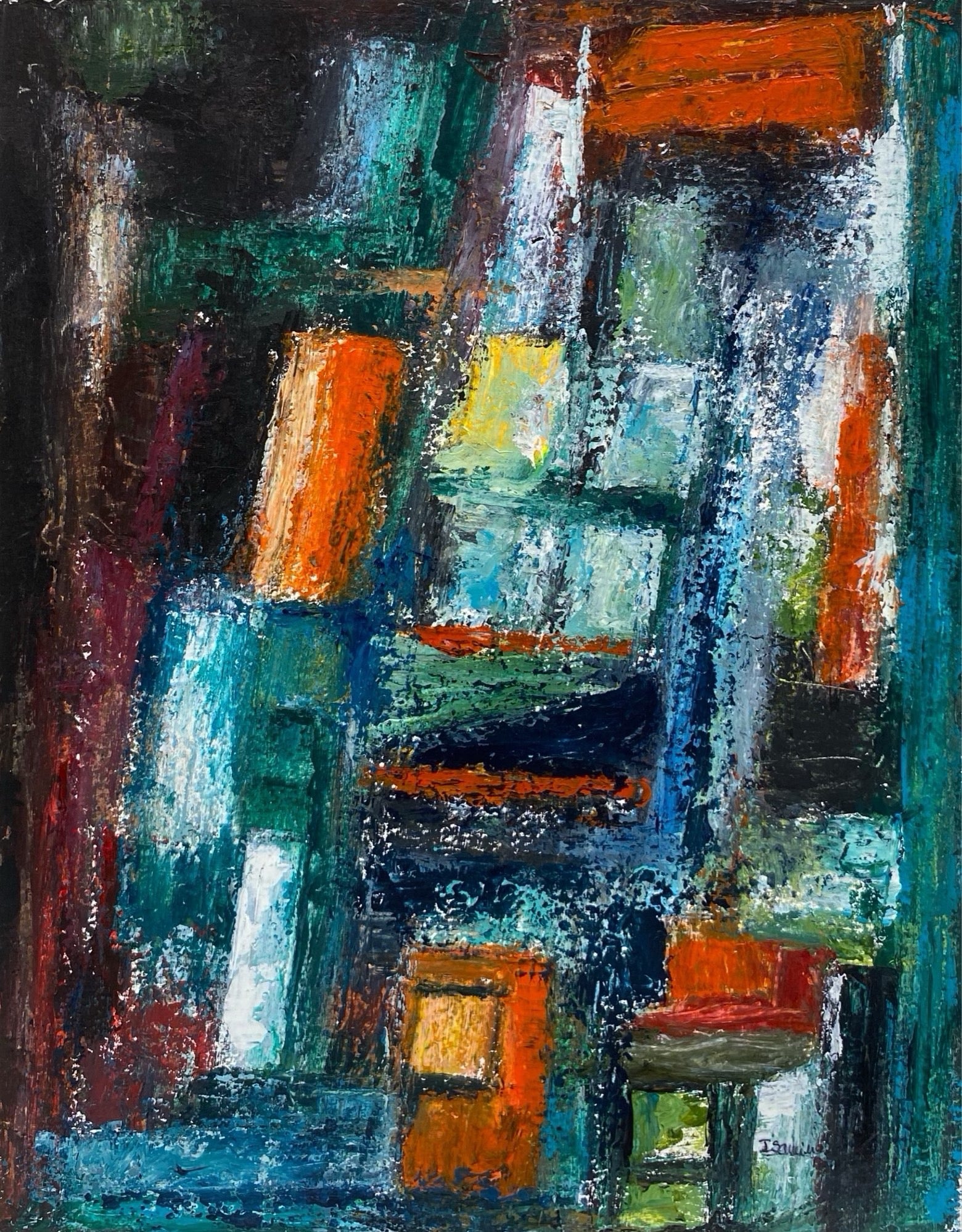 Dynamic essence of an urban landscape through bold, textured strokes and vibrant colors. This abstract composition, dominated by deep blues, energetic oranges, and flashes of yellow, evokes the feeling of a bustling metropolis seen through a fragmented, expressive lens. The layered brushstrokes suggest movement, sound, and the interconnected pathways of city life, each color block representing the vibrancy of a city's heartbeat. This piece invites viewers to explore the organized chaos and vivid energy that defines urban existence.