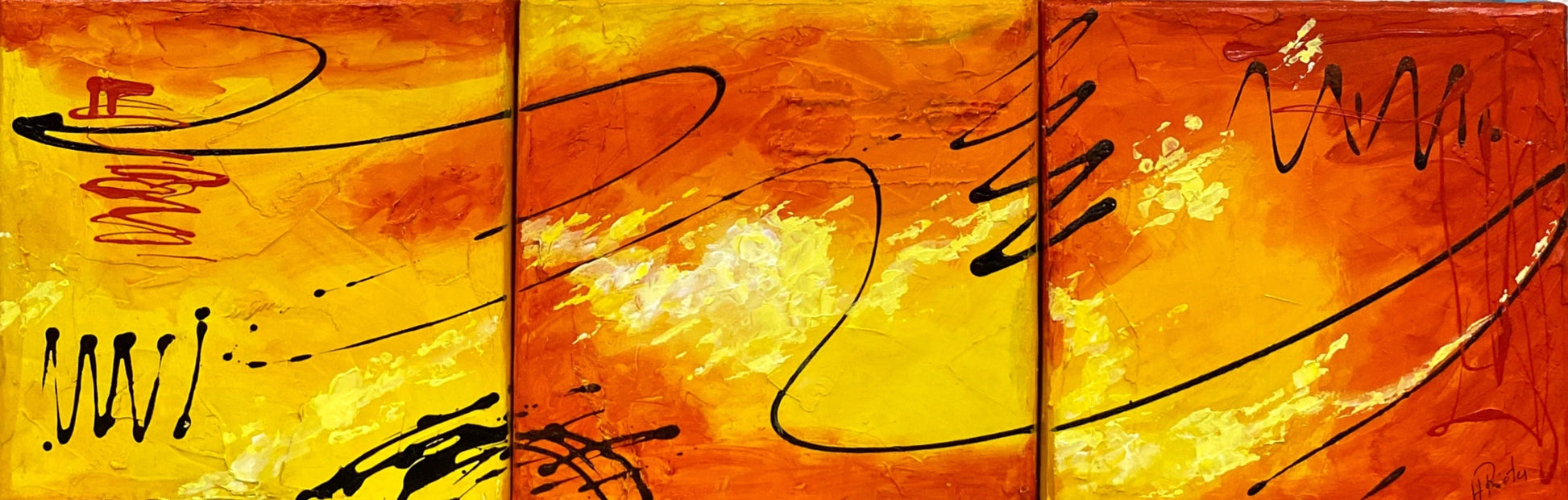 Abstract triptych that exudes warmth and energy. Vibrant hues of yellow and orange blend seamlessly across the three panels, evoking the intense heat and glow of the sun.