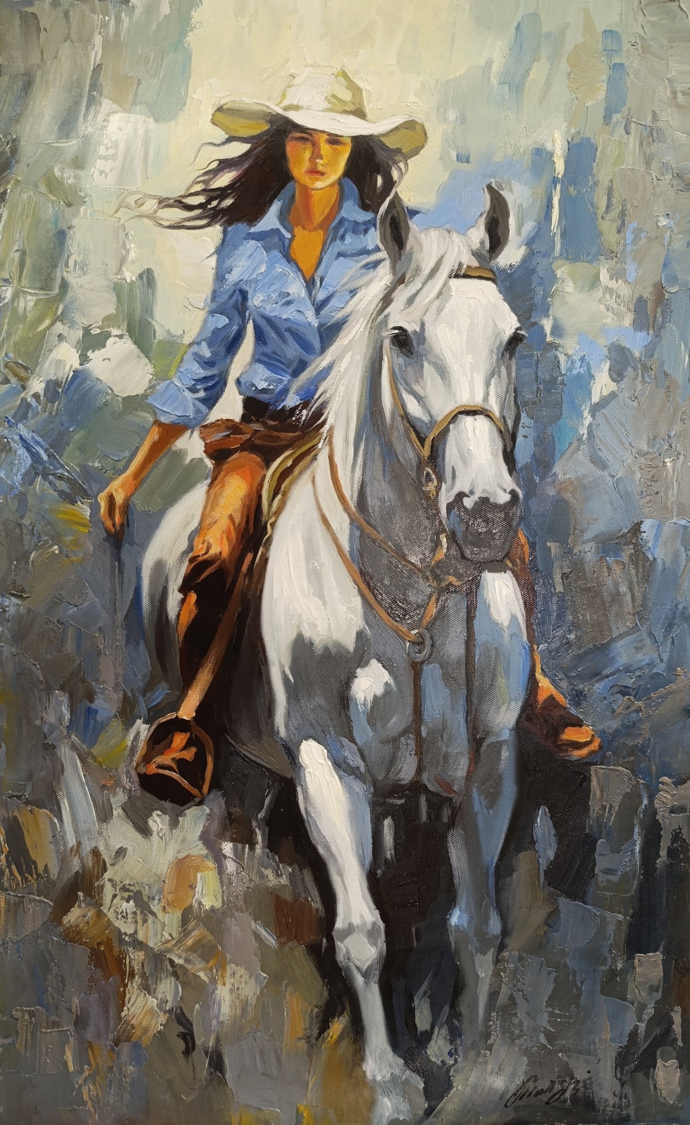 Embrace the spirit of freedom and adventure with this captivating painting of a bold rider on a majestic white horse. The dynamic brushstrokes and energetic composition capture the exhilaration of the open range, making it a perfect statement piece for any space. Whether you’re an equestrian enthusiast or simply drawn to powerful, evocative art, this piece brings a sense of motion, strength, and the untamed beauty of the wild west to your home or office.