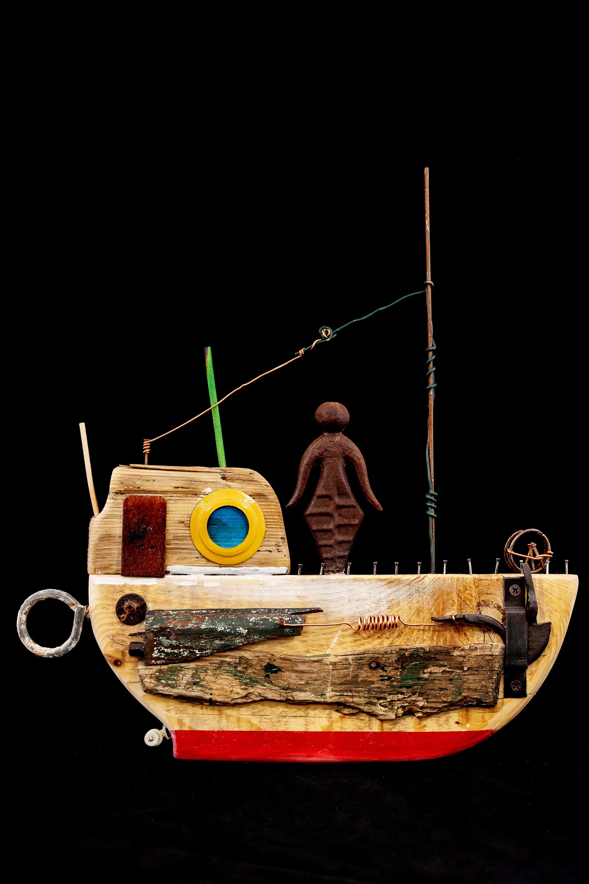 A small, intricately assembled boat sculpture that captures the essence of seafaring life. Its use of mixed media and attention to detail, such as the miniature figure and textural contrasts, make it a captivating piece that tells a rich narrative.