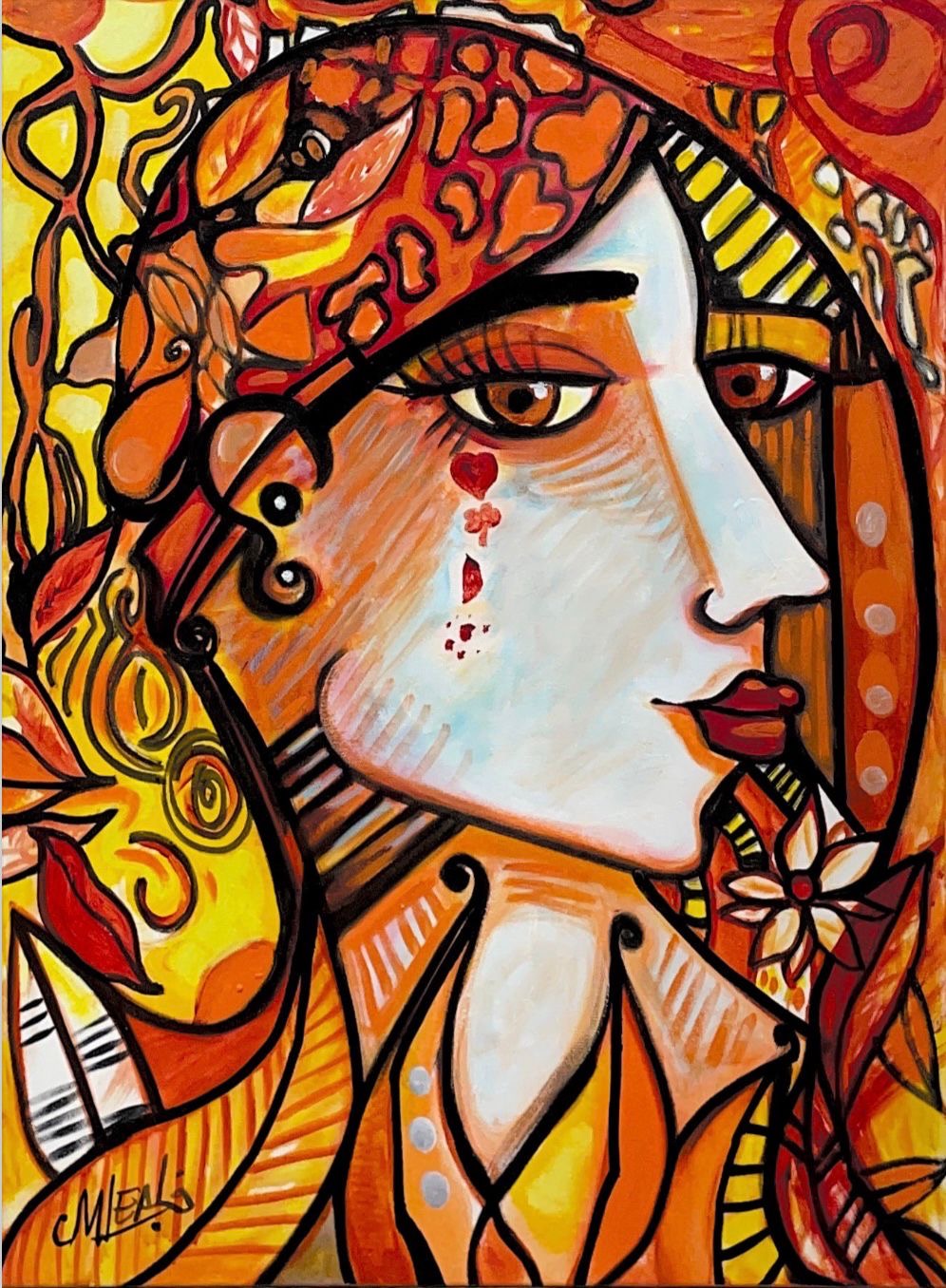 An artistic portrait of a woman in profile, surrounded by floral and abstract motifs. Warm colors like orange, yellow, and red dominate the canvas, creating a rich and expressive atmosphere. Her face shows serenity, accentuated by the decorative elements around her.