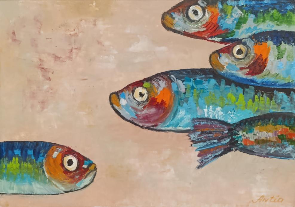 This vibrant oil painting on paper by Anastasia Antia features a group of colorful sardines, each rendered with bright, lively strokes that bring the fish to life. The simplistic background in soft beige tones allows the colorful sardines, painted in blues, greens, reds, and oranges, to stand out in contrast. Their expressive, almost human-like eyes give them personality, infusing the painting with a playful energy. The composition is minimalist yet dynamic, evoking a sense of movement as the sardines seem to swim across the paper.