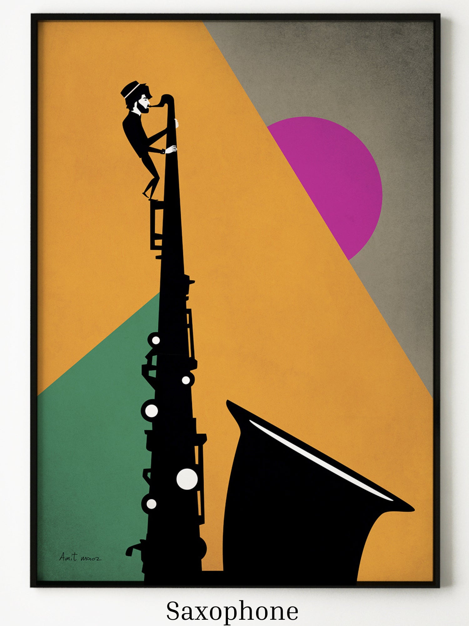 The minimalist design emphasizes the harmony between the player and the saxophone's soulful curves.